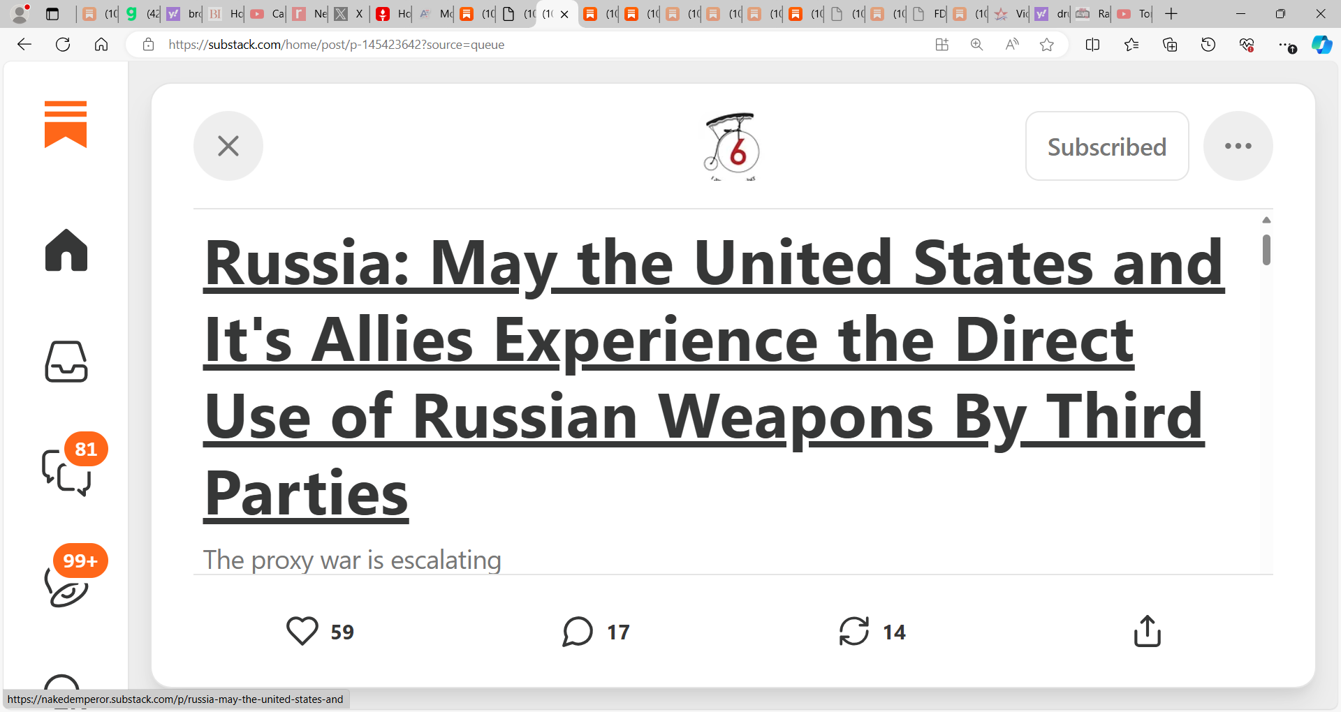 The prospect of Russia & US in a World War is become real with Biden Inc. and maybe they will start it before the US election to suspend elections? NE - NAKEDEMPEROR.SUBSTACK.COM was stunning & we
