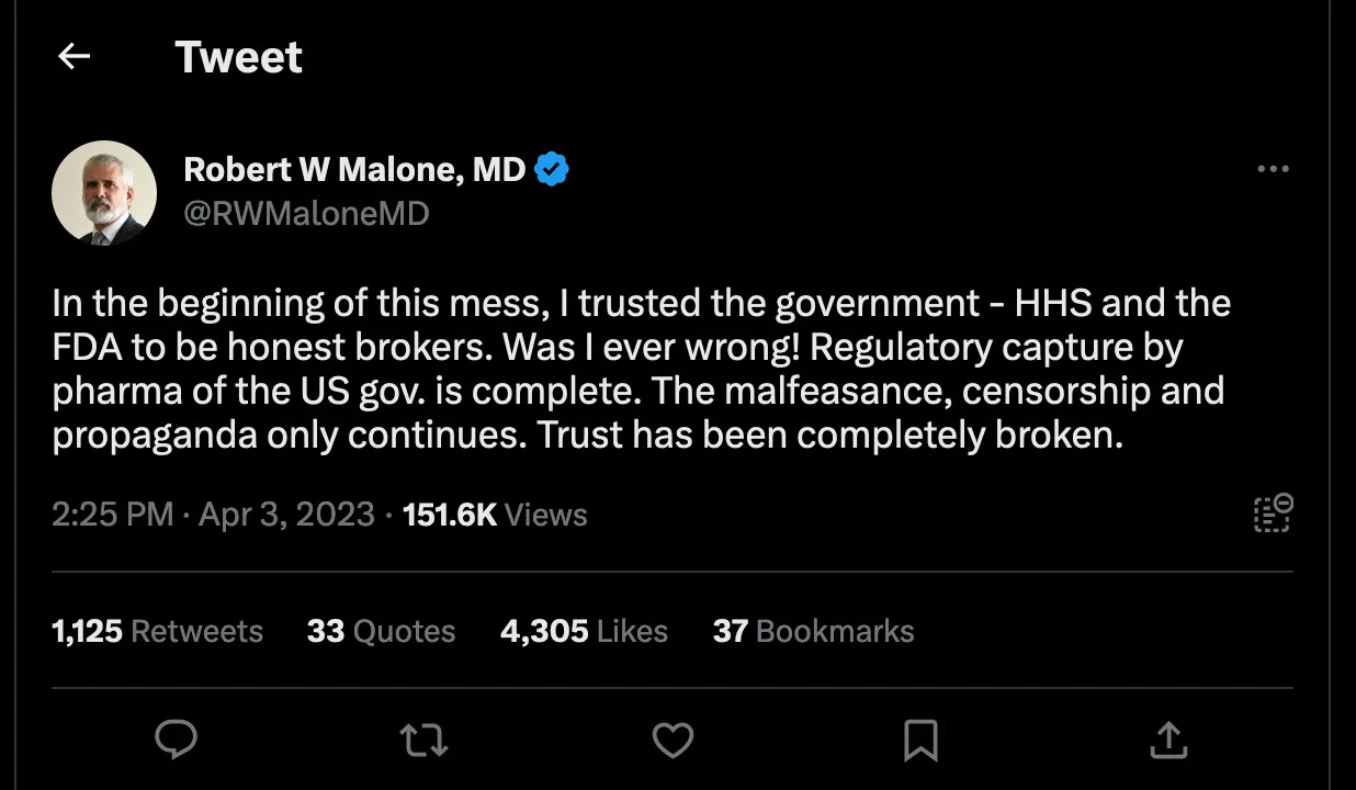 Malone confessed: “I am as a physician and scientist who happened to have had a role in the genesis of this (mRNA) technology when I was a young man back in 1987 to 1990. I'm very, very familiar with the technology, worked as an academic to try to advance it until I determined that I could not overcome the toxicity associated with it, and abandoned it for other technology platforms, which I've also developed.” 22