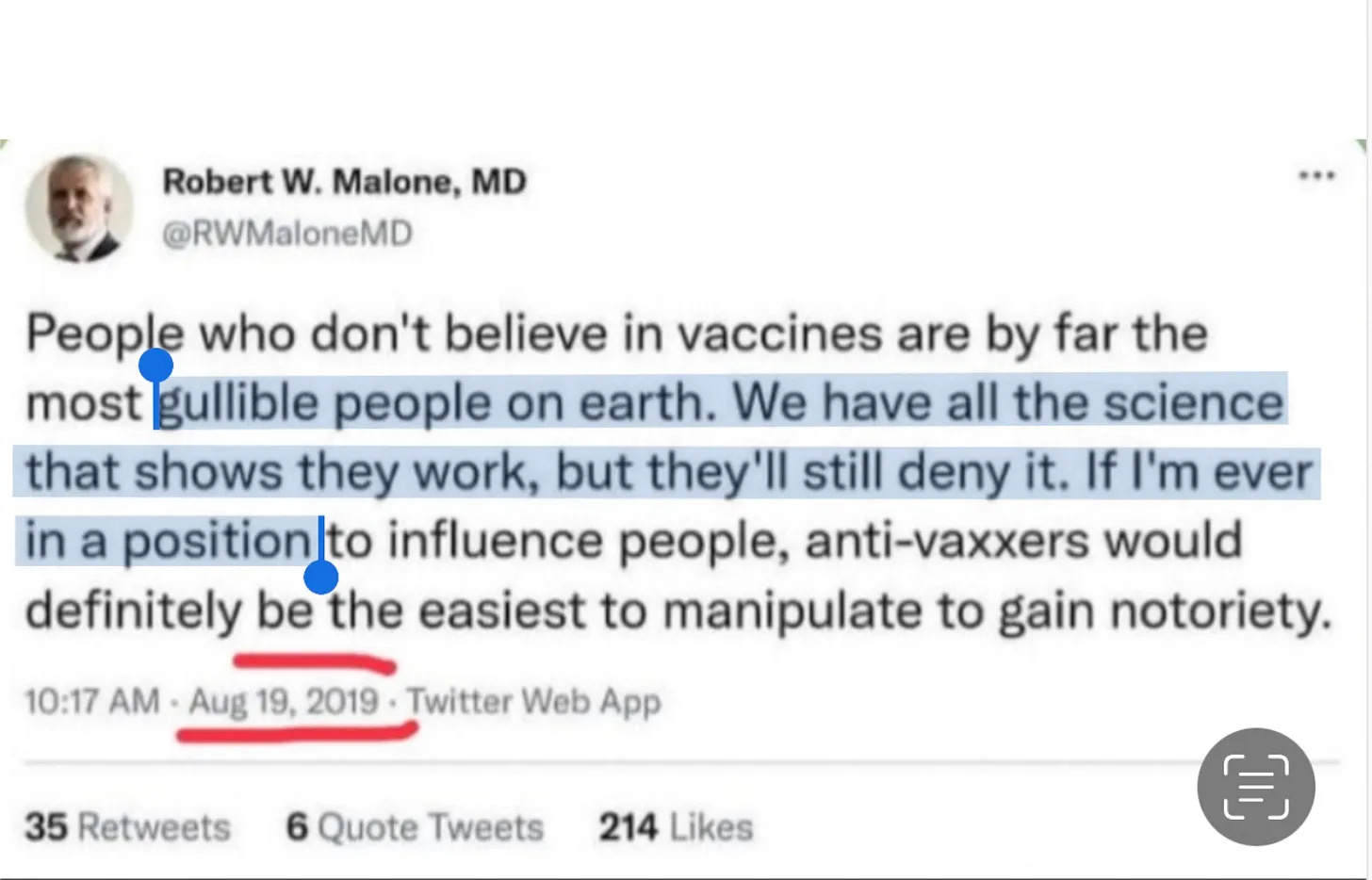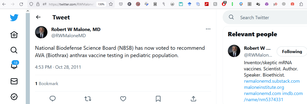 In 2011, he twitted “National Biodefense Science Board (NBSB) has now voted to recommend AVA (Biothrax) anthrax vaccine testing in pediatric population.” 32 This defies many human rights: you cannot under any circumstance experiment on healthy children (like they did with the Emergency-Use-Authorization COVID shots). Needless to say, that vax poison completely failed to protect against anthrax but injured those children. No message from Malone about that.