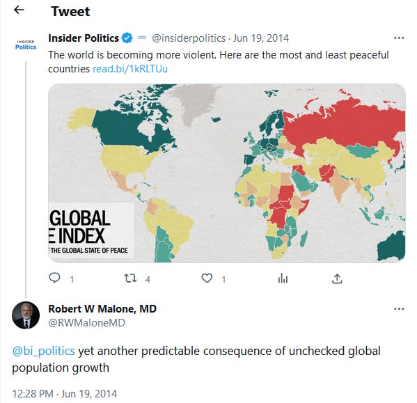 By 2014 Malone was a depopulation fanatic. When commenting “The world is becoming more violent. Here are the most and least peaceful countries”, he twitted “yet another predictable consequence of unchecked global population growth.”
