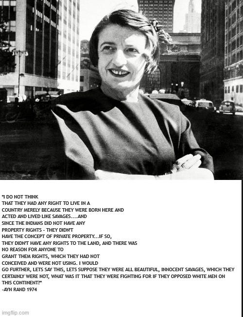 Ayn Rand’s address at West Point 1974: “Indians did not have any property rights—they didn’t have the concept of property; … so, they didn’t have any rights to the land, and there was no reason for anyone to grant them rights which they had not conceived and were not using. … if a country does not protect rights—if a given tribe is the slave of its own tribal chief—why should you respect the rights they do not have? Or any country which has a dictatorship. Government—the citizens still have individual rights—but the country does not have any rights. Anyone has the right to invade it, because rights are not recognized in this country… Any white person who brings the elements of civilization had the right to take over this continent, and it is great that some people did.”