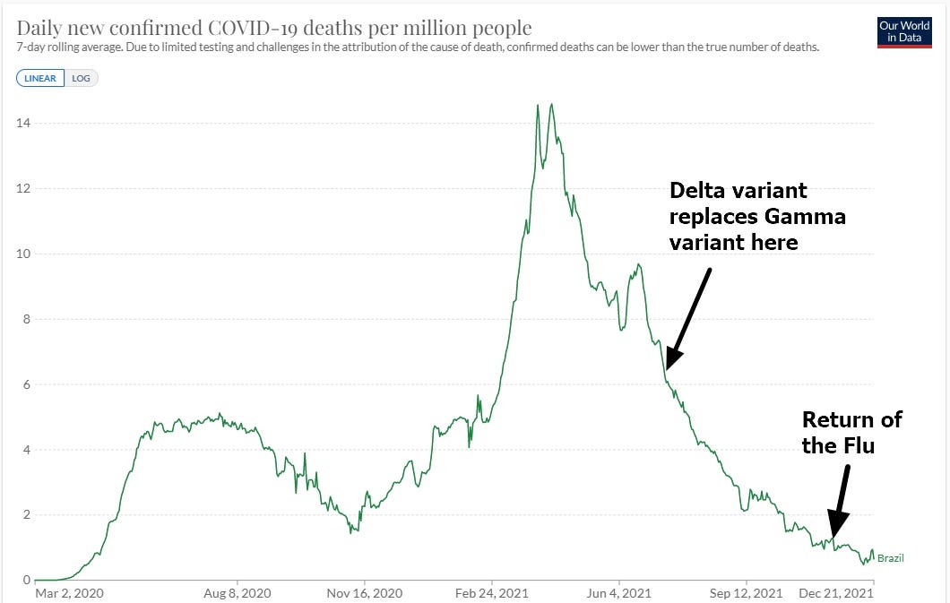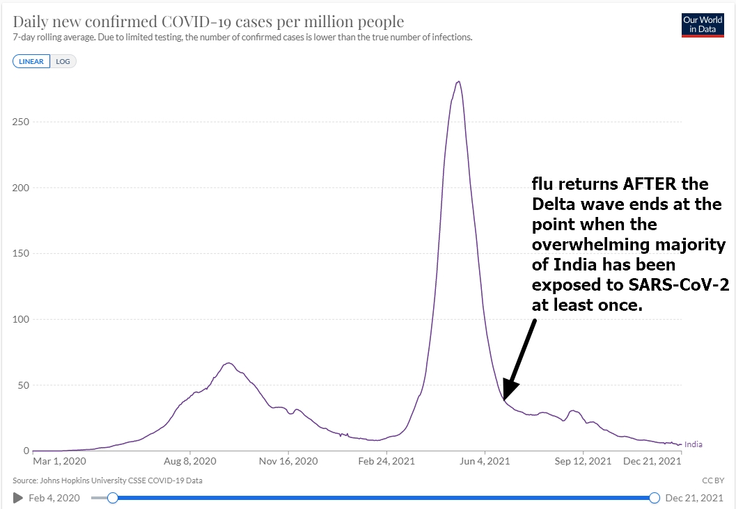 These studies below on viral interference are particularly informative and I share. There are also 3 graphs below showing when influenza returned in India and Brazil and South Africa and it did when the Delta wave was at its lowest (declining) and even before Omicron. When flu returned, India as an example, had reached, we argue, herd immunity with lots of natural immunity. S Africa is very fascinating for it seems that flu is co-existing with Omicron (no displacement of either); very interesting and it may be that both are similarly very benign and mild and so can co-exist??? More study and discussion on this.