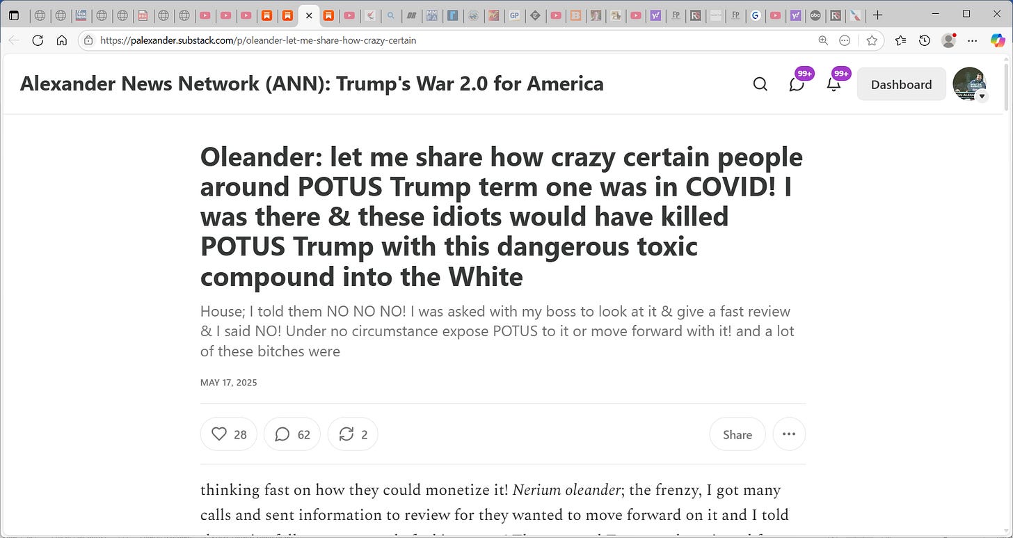 The sharing of Oleander below was critical for I wanted you to know that rich potent people were pulling on Trump at height of fraud PCR-created fake pandemic COVID to stand on podium & say he took