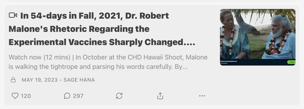 And Bob Malone telling the young lady in HI that the virus also may affect fertility and other mealy mouth “adults are arguing about this stuff” weak sauce pronouncements before catapulting into full Jabs Bad Warrior 54-days later long after the shots were in.