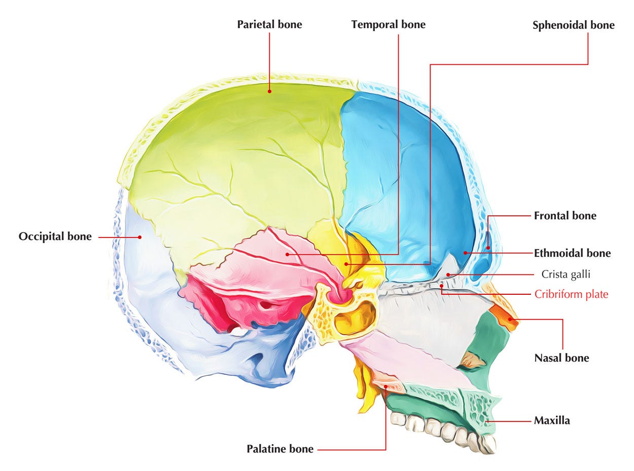 person, could do lots of damage; A fractured cribriform plate (anterior skull trauma) can result in leaking of cerebrospinal fluid into the nose and loss of sense of smell. It is a medical emergency
