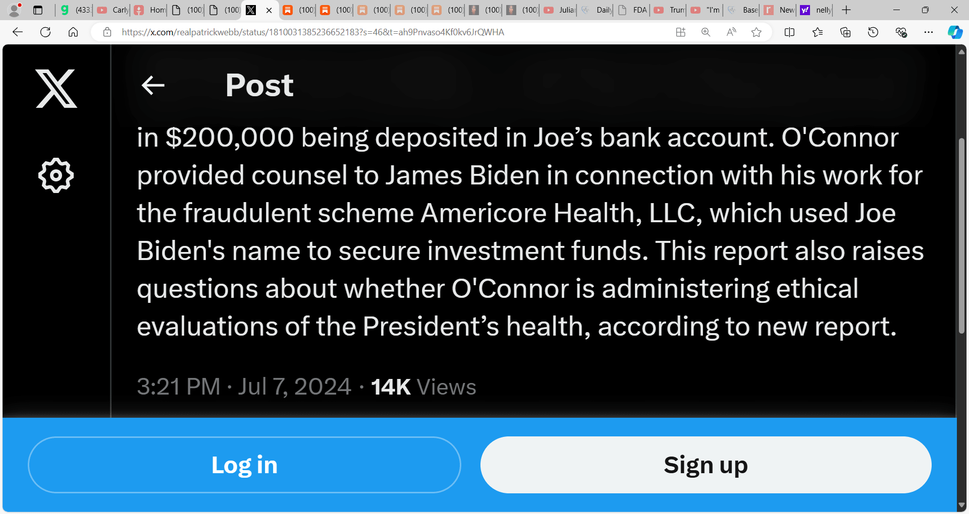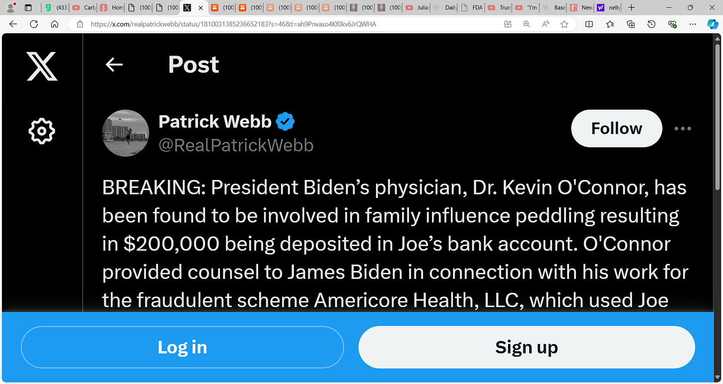 Theresa Gentile (subscriber) shared a very troubling TWEET by Patrick Webb of possible collusion & business dealings involving POTUS Biden ($200,000), brother James & 46's doctor Dr. Kevin O'Connor