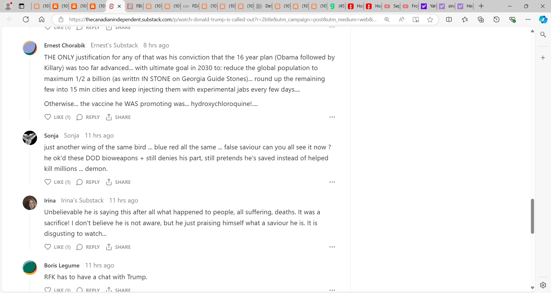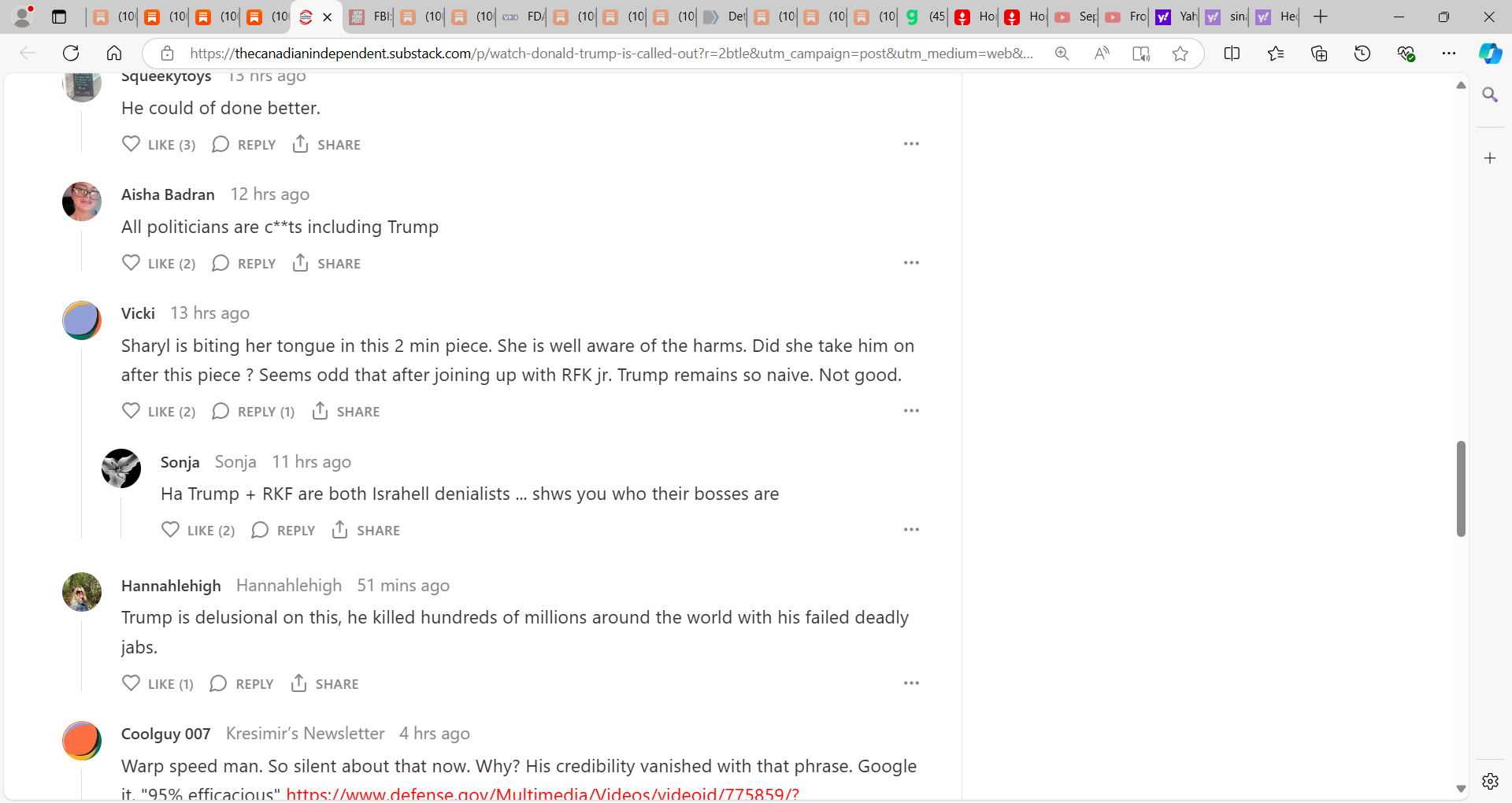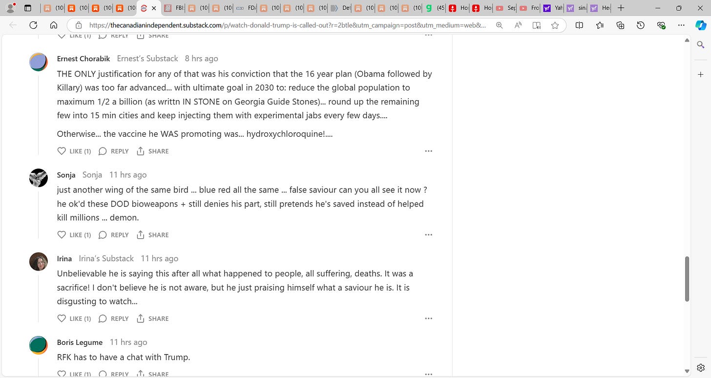 You're correct. As much as Trump is seemingly the only option, he needs to get in front of this and spill the beans, as does RFK Jr, who, frankly, is kind of full of sh!t on the quackcine issue as he states "his kids are all vaxxed" and we need "safe vaccines". There is no such thing. Never was. Never will be. This has been proven since the early 1900s. And if it WERE possible to make "safe vaccines" (which no one on the planet needs anyway, but that's the topic of another discussion), then big pHARMa wouldn't have to have to be shielded from liability for making these toxic products. There is no vaccine EVER made that has been tested for safety and efficacy. Not a single one, including the covid bioweapon jab. That's why this bioweapon injection was released under the auspices of a "vaccine", because no safety OR efficacy needs to be established; and there's no liability to anyone, including the manufacturer, for administering these poisons. And this is something else that Trump should be aware of. It's common knowledge.
