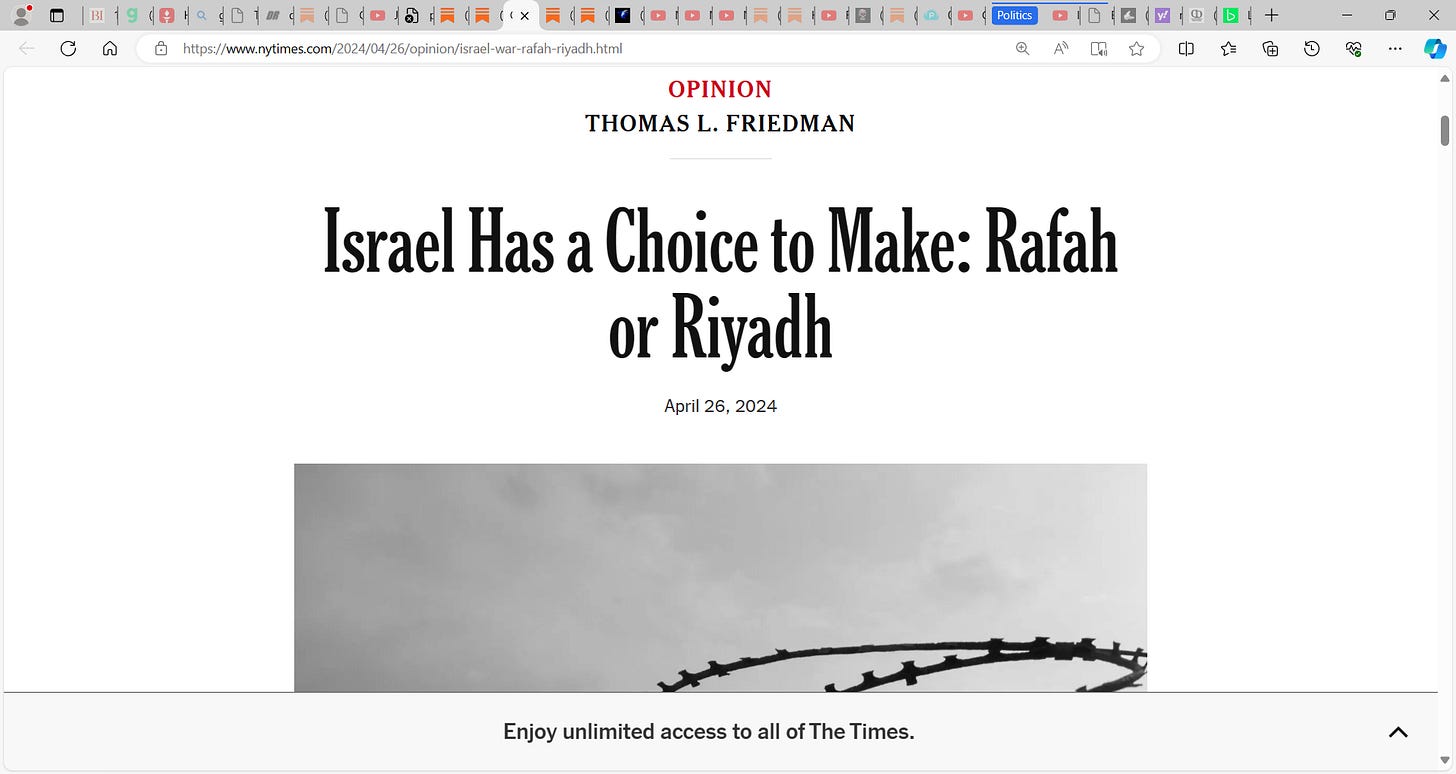 Thomas Friedman I have long considered a leftist nincompoop dolt moron on his best of days yet I am for openness & non-censorship so I wanted to share this NYT piece on Israel & Rafah & Riyadh & Hamas