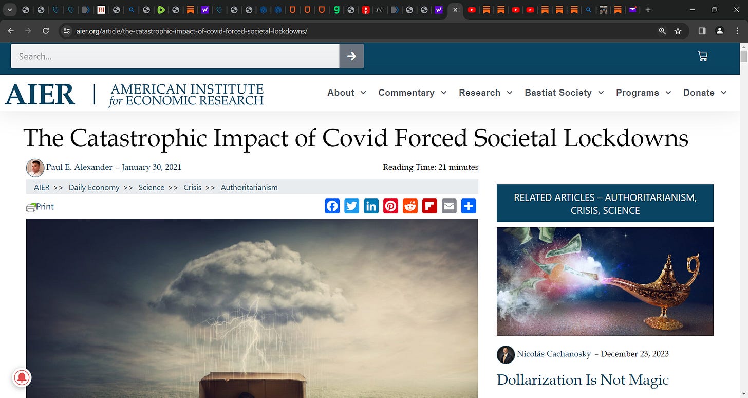 Three years ago, end of 2020 or so, I wrote this anti-COVID 'lockdown' paper (for AIER, Tucker then leading AIER before Brownstone) arguing against societal lockdowns for COVID as well as BROWNSTONE