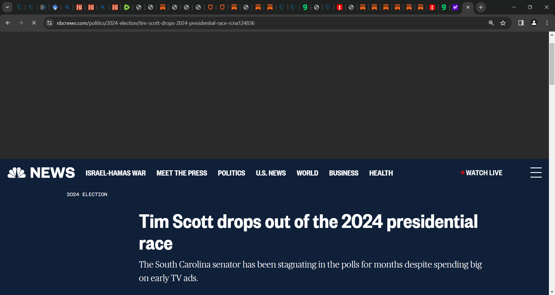 Tim Scott drops out of the 2024 presidential race; The South Carolina senator has been stagnating in the polls for months despite spending big on early TV ads; I know Tim, fantastic patriot, brilliant