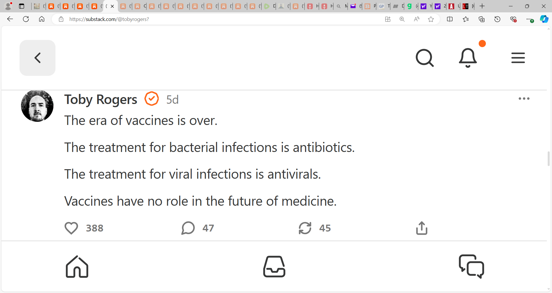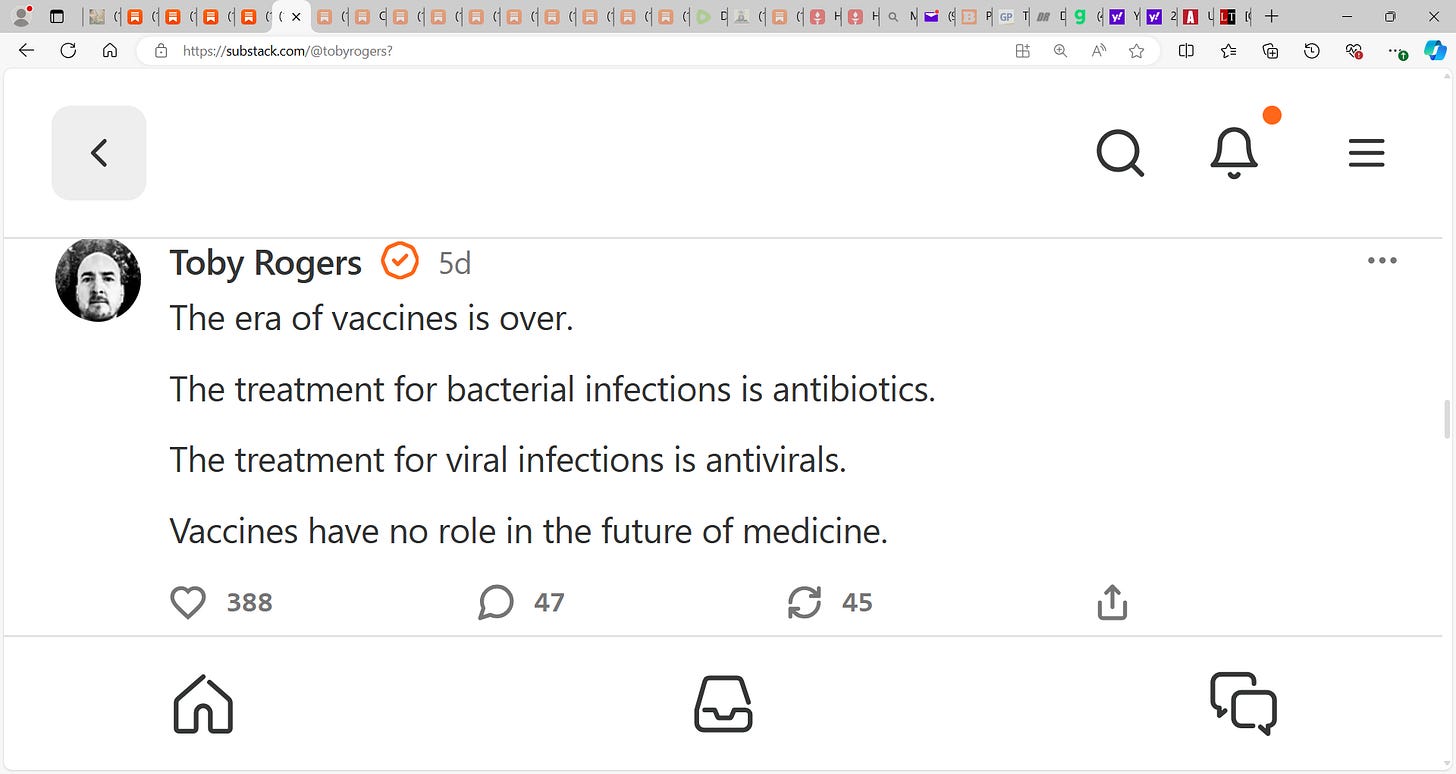 Toby Rogers is clear, concise & I wanted to showcase his words: "The era of vaccines is over. The treatment for bacterial infections is antibiotics. The treatment for viral infections is antivirals.