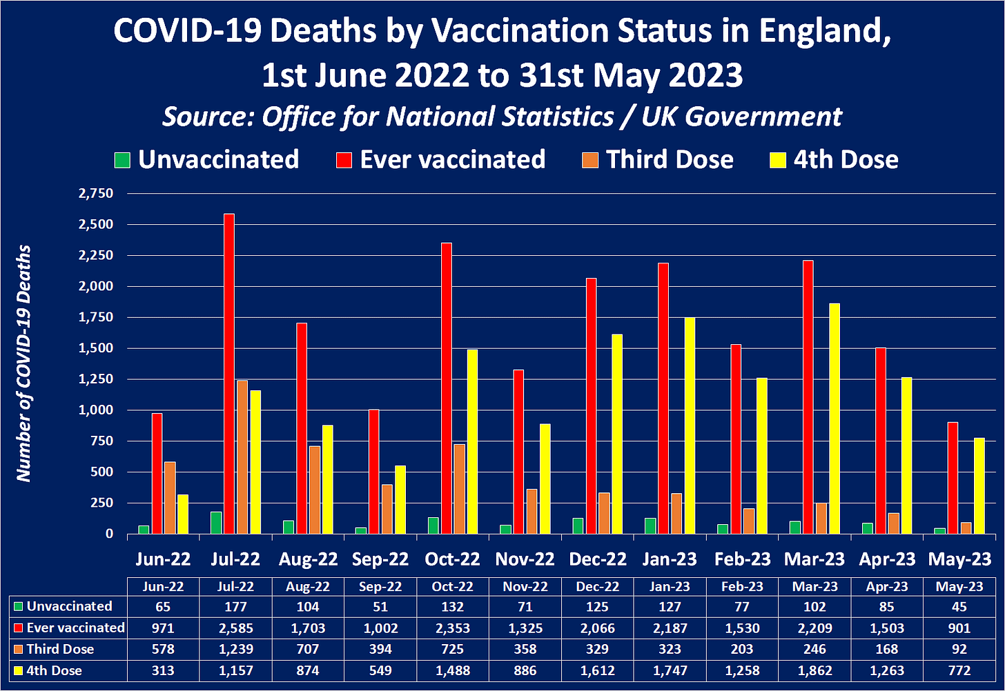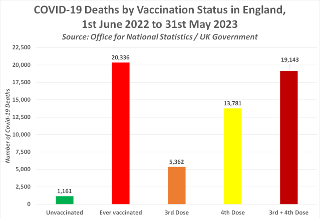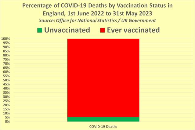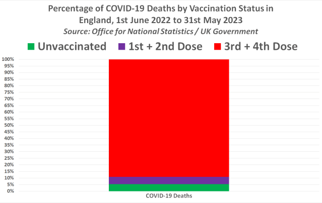 This means, as is shown in the following chart, that the vaccinated population in England accounted for 95% of COVID-19 deaths between 1st June 2022 and 31st May 2023. Whereas the unvaccinated population accounted for just 5%.