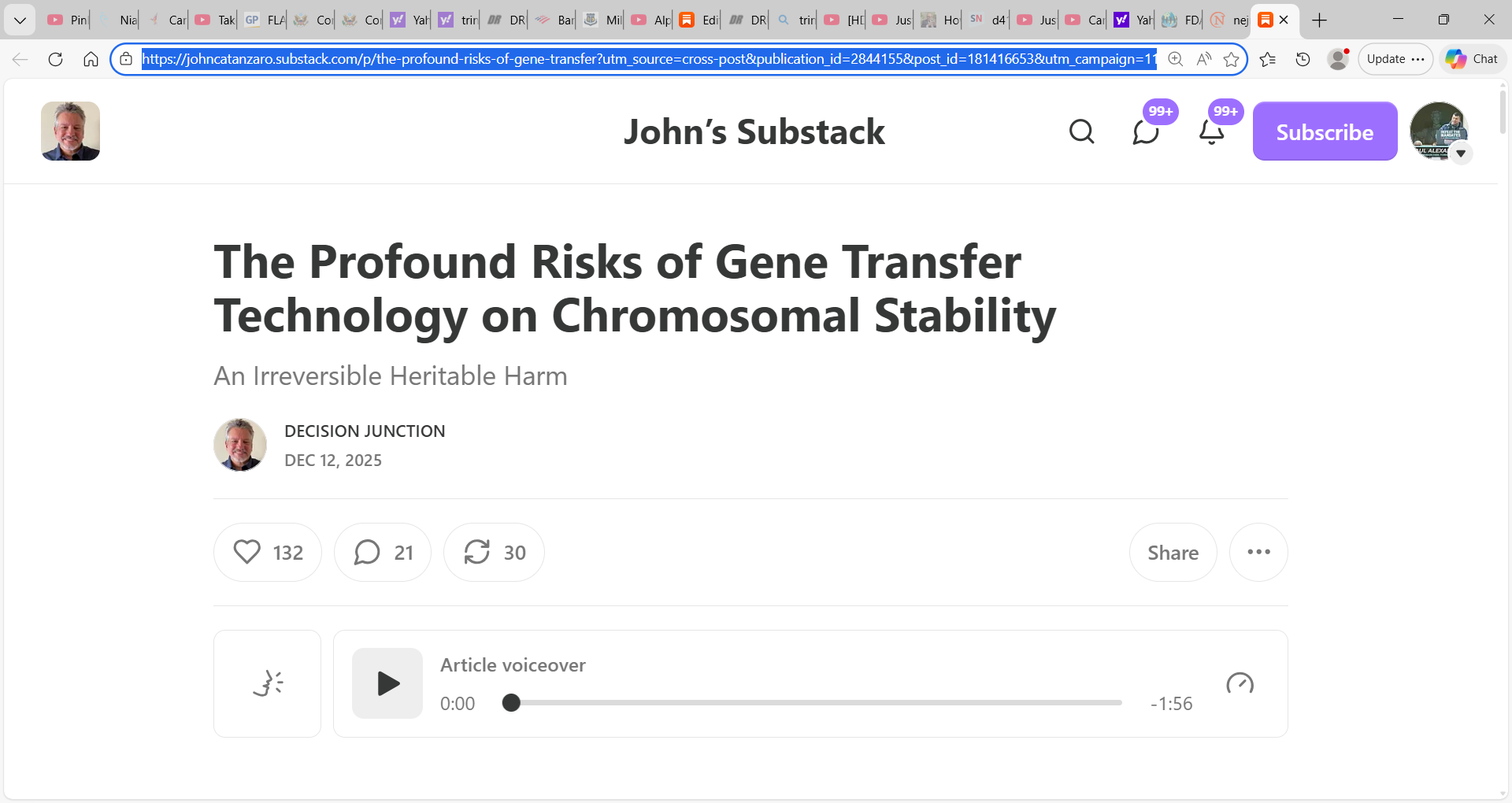 Troubling stack by Decision Junction: "The Profound Risks of Gene Transfer Technology on Chromosomal Stability An Irreversible Heritable Harm" e.g. Malone Bourla et al. mRNA technology, CRISPR, small