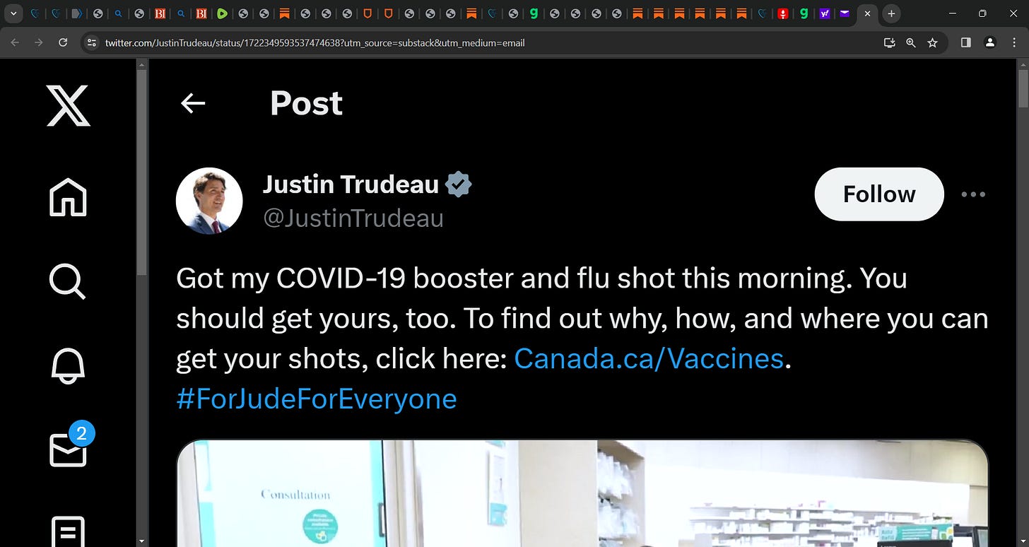 Trudeau: Canadian Prime Minister Trudeau wrote on Twitter "Got my COVID-19 booster and flu shot this morning. You should get yours, too."; now would someone tell his moronic health advisors Njoo, Tam,