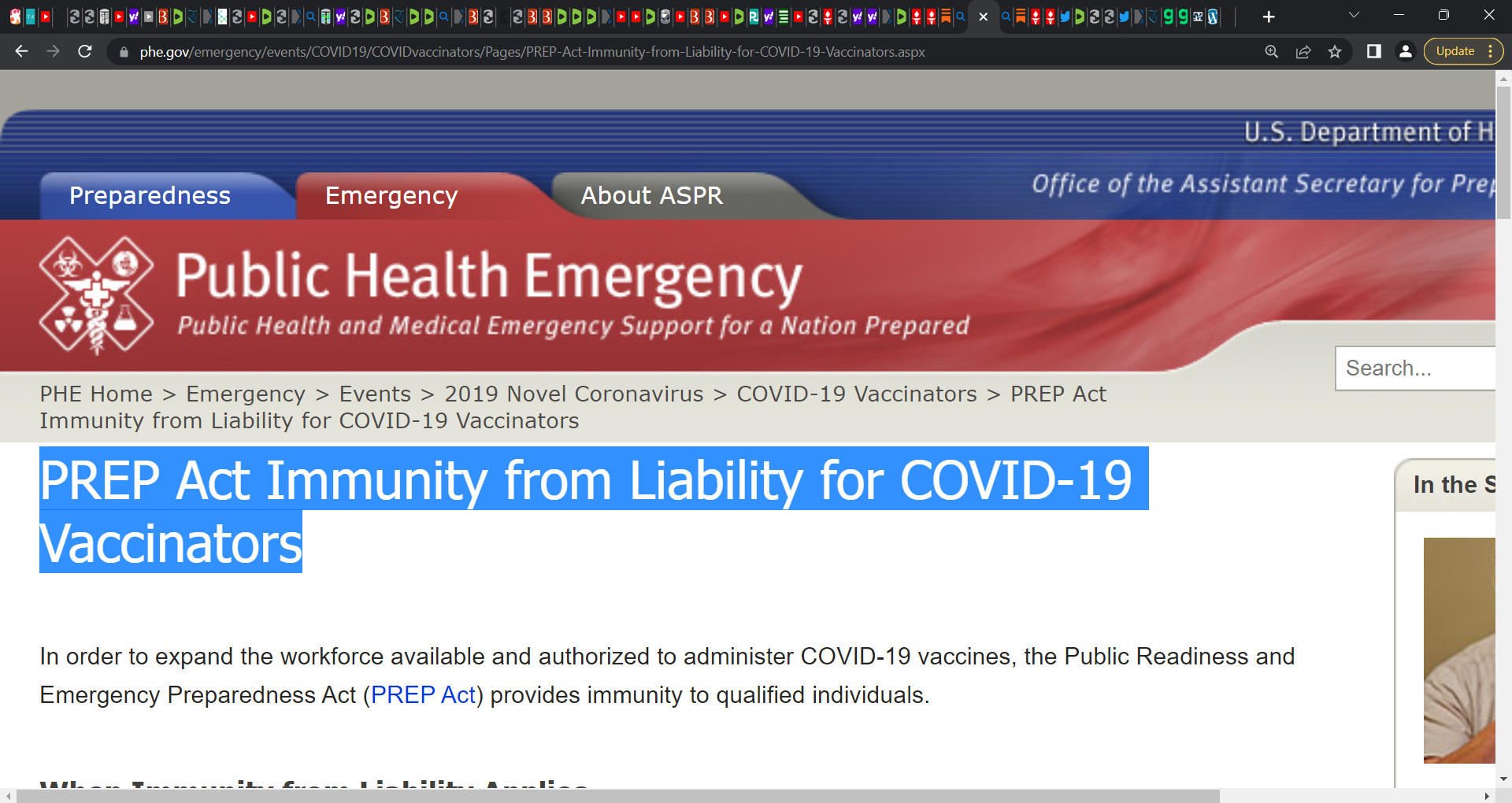 ‘Under the PREP Act, a qualified person is a covered person. Except for willful misconduct, a covered person is immune from lawsuits and liability under federal and state law with respect to all claims for loss resulting from the administration or use of a covered countermeasure, such as a COVID-19 vaccine, if they meet criteria stated in a declaration under the PREP Act issued for the health emergency or threat and covered countermeasure.’