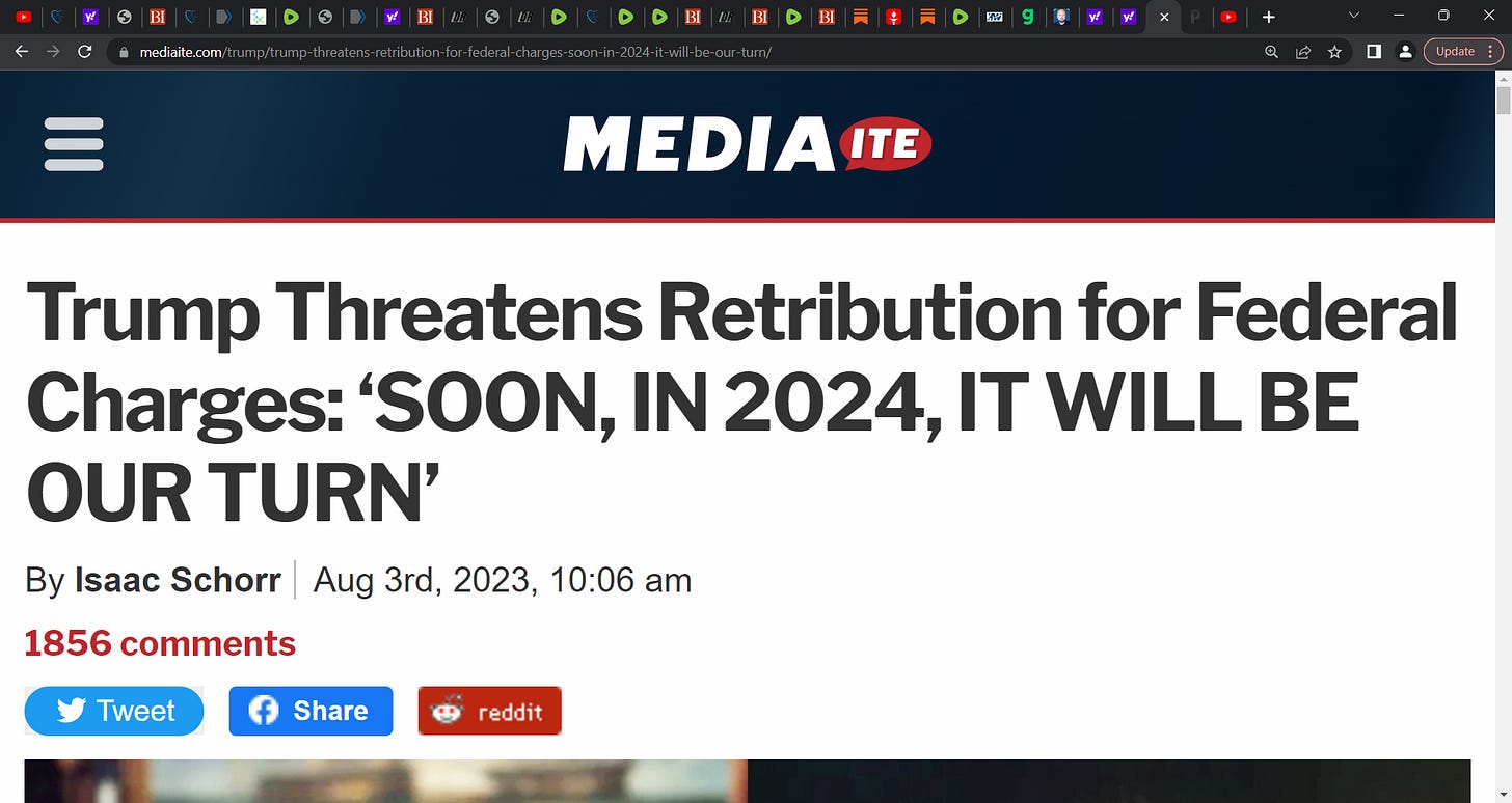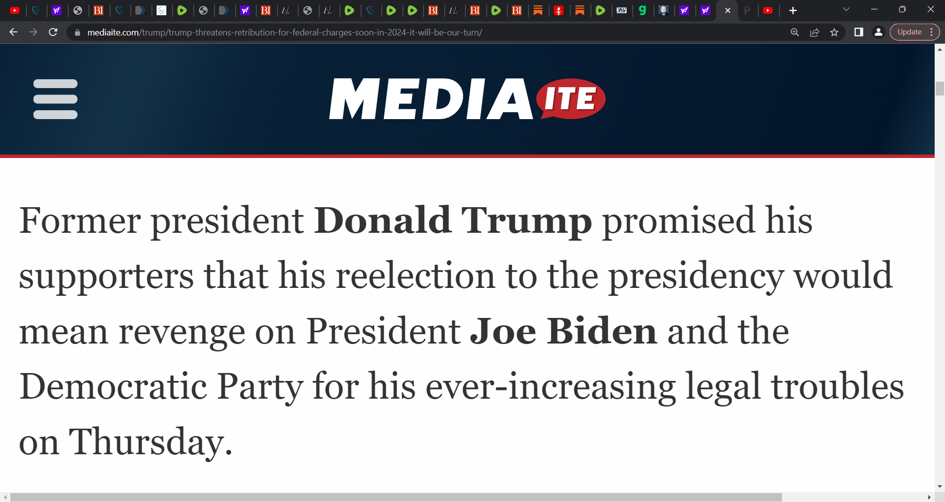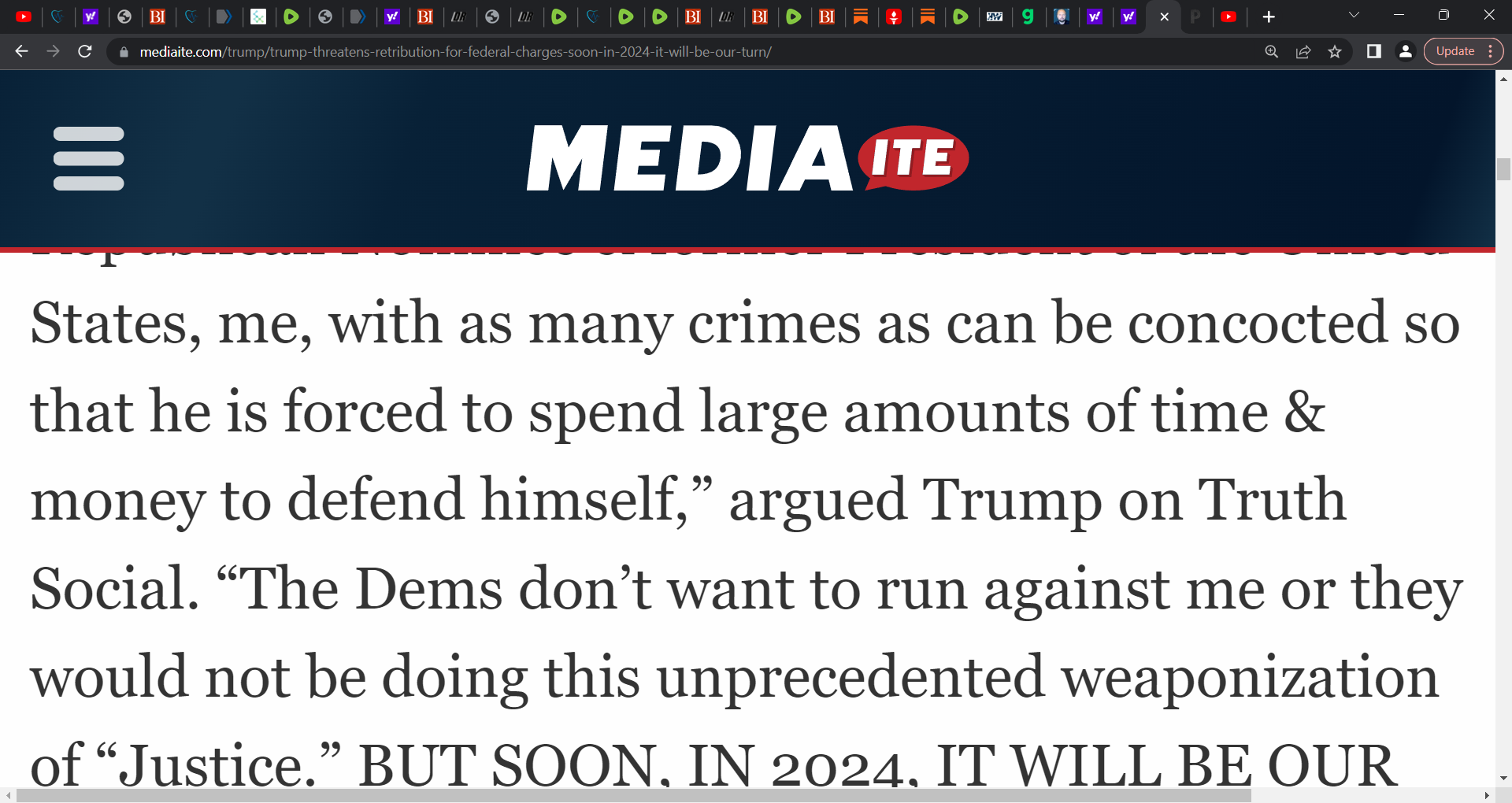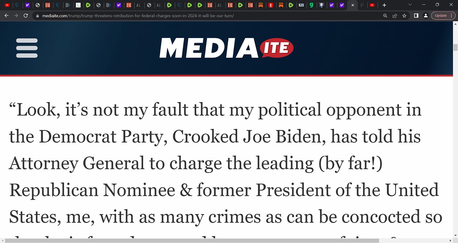 'Trump Threatens Retribution for Federal Charges: ‘SOON, IN 2024, IT WILL BE OUR TURN’; I agree, not retribution as much as use the same processes they use & punish them with it, all of them