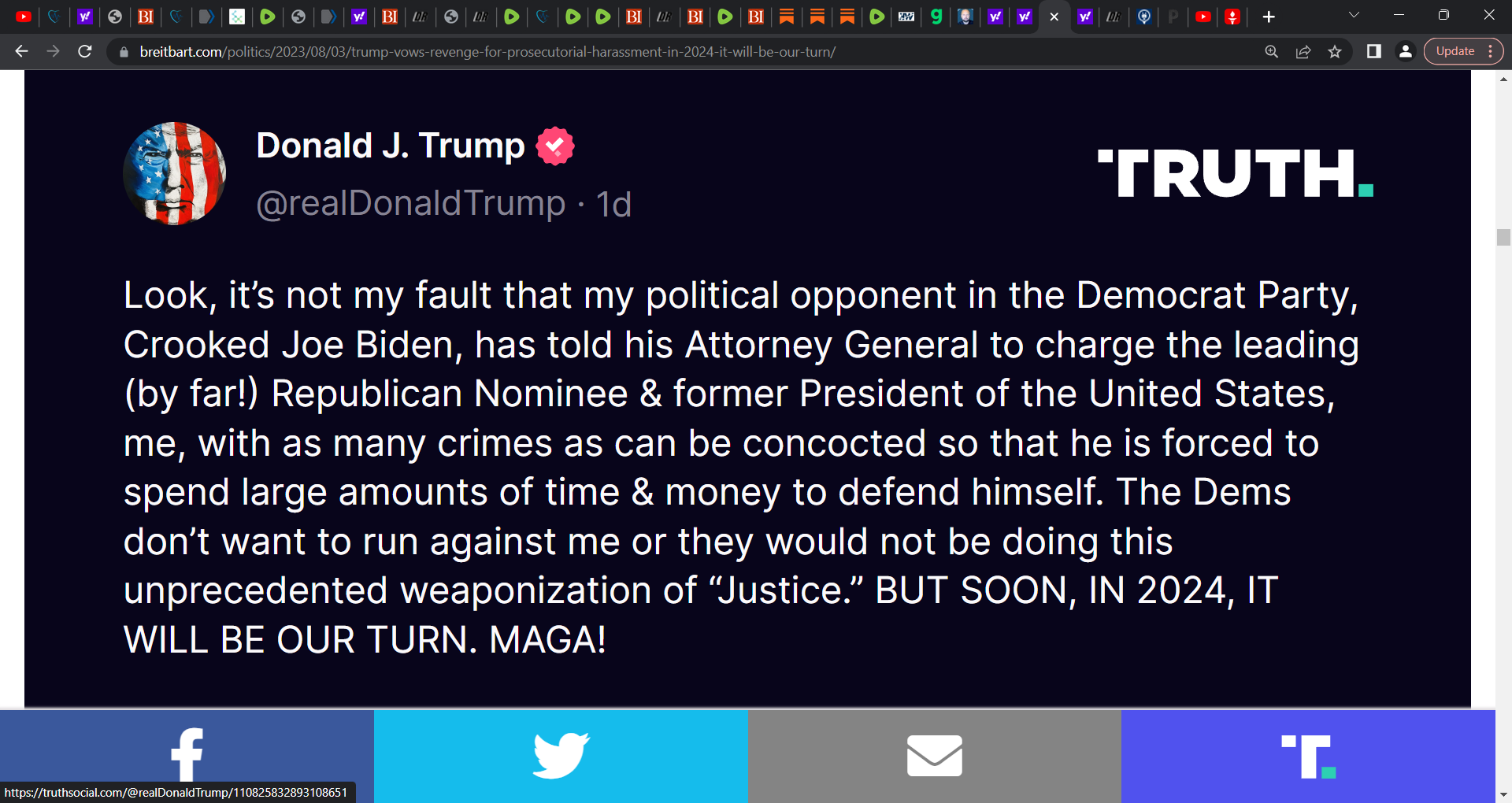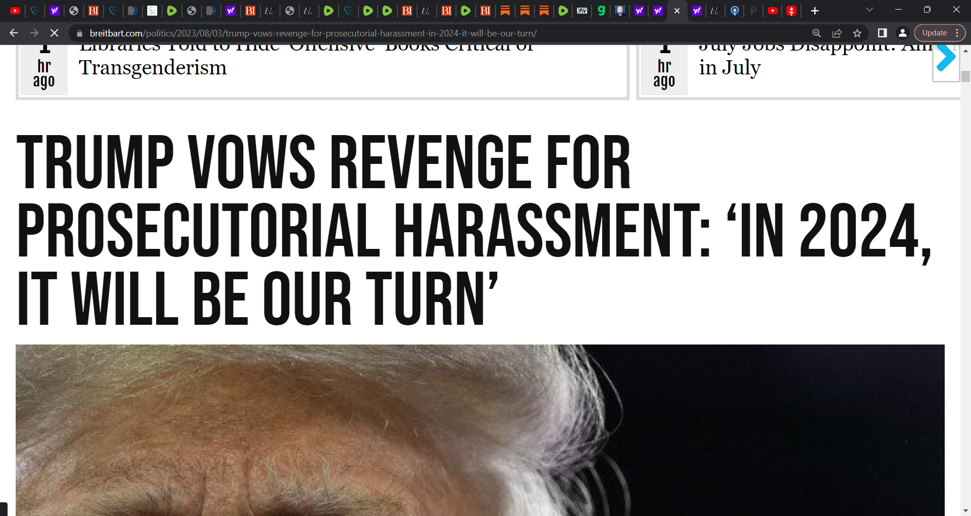'Trump Vows Revenge for Prosecutorial Harassment: ‘In 2024, It Will Be Our Turn’'; IMO, the only person running for POTUS who can fix America and jail as many of the malcreants, the dangerous America