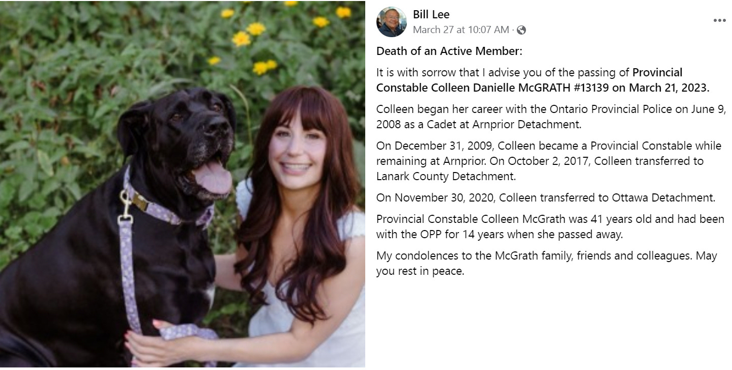 Ottawa, ON - 41 yo Ontario Provincial Police Constable Colleen Danielle McGrath died on March 21, 2023. She was diagnosed with breast cancer in Nov.2021 after her employer illegally mandated COVID-19 mRNA vaccines
