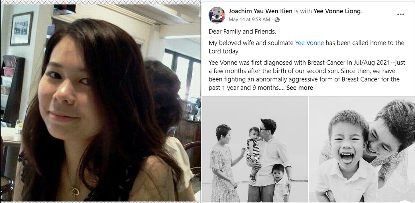 Singapore - 37 yo UK (NHS) trained doctor Yee Vonne Liong was diagnosed with aggressive breast cancer in Jul/Aug.2021. It spread to her brain and she died on May 14, 2023.