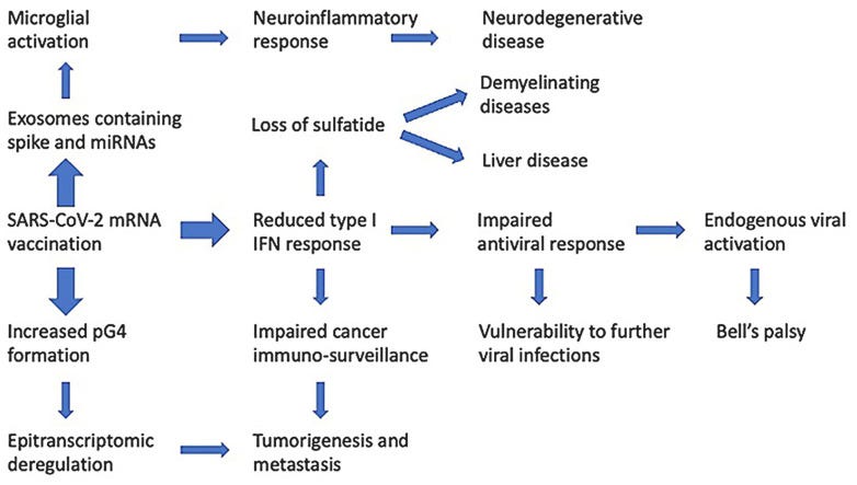 ‘Immune cells that have taken up the vaccine nanoparticles release into circulation large numbers of exosomes containing spike protein along with critical microRNAs that induce a signaling response in recipient cells at distant sites. We also identify potential profound disturbances in regulatory control of protein synthesis and cancer surveillance. These disturbances potentially have a causal link to neurodegenerative disease, myocarditis, immune thrombocytopenia, Bell's palsy, liver disease, impaired adaptive immunity, impaired DNA damage response and tumorigenesis.’