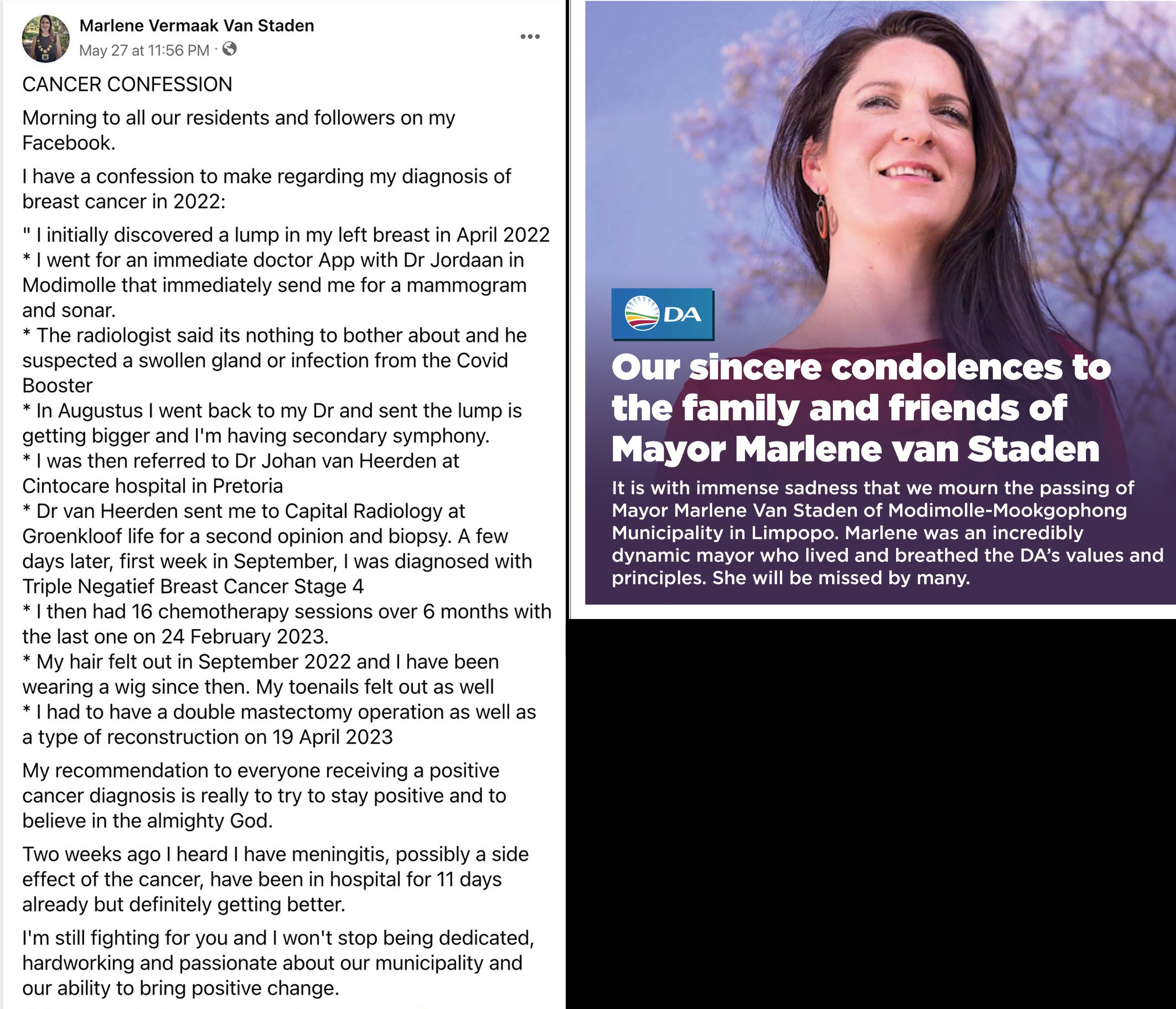 South African Mayor, 42 year old Marlene Vermaak Van Staden had a lump after COVID-19 booster shot, it was a stage 4 turbo breast cancer, she died 10 months later on June 5, 2023