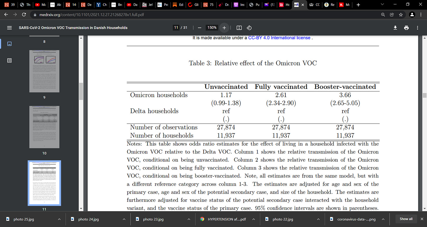 see table 3, page 11 here…vaccines are causing the super-spreading of Omicron in the homes, but we can infer everywhere. Yes, there is immune escape, but the vaccine is lighting a fire…we actually see a dose response. Some argue it could be the immune system is suppressed post vaccine but we are really talking about secondary transmission here and there appears to be a clear link with vaccine and more vaccine at that.