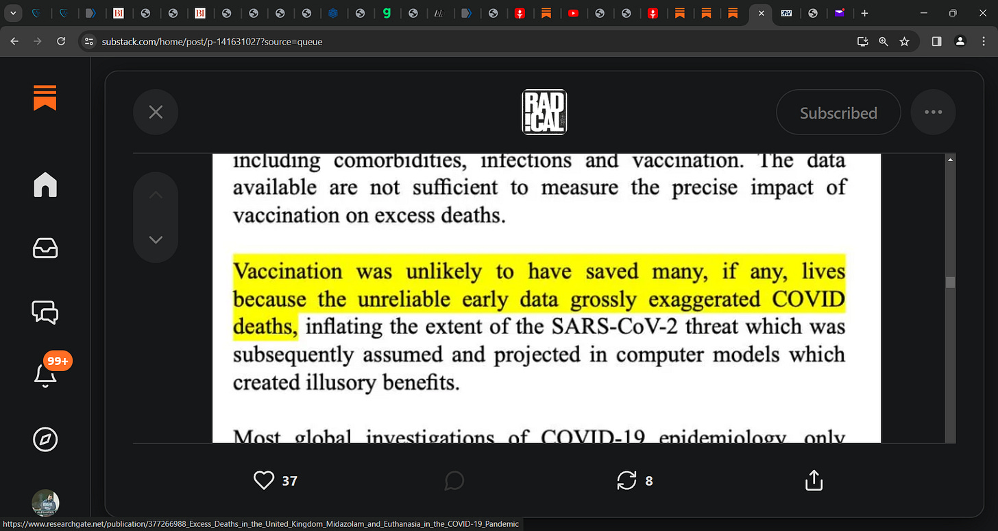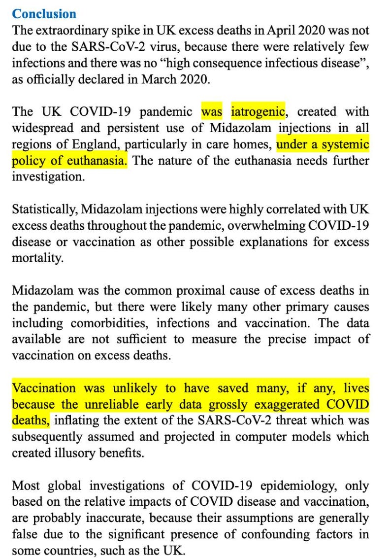“Midazolam was the common proximal cause of excess deaths in the pandemic, but there were likely many other primary causes including comorbidities, infections and vaccination. The data available are not sufficient to measure the precise impact of vaccination on excess deaths. Vaccination was unlikely to have saved many, if any, lives because the unreliable early data grossly exaggerated COVID deaths, inflating the extent of the SARS-CoV-2 threat which was subsequently assumed and projected in computer models which created illusory benefits.”