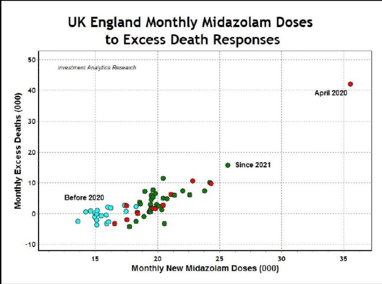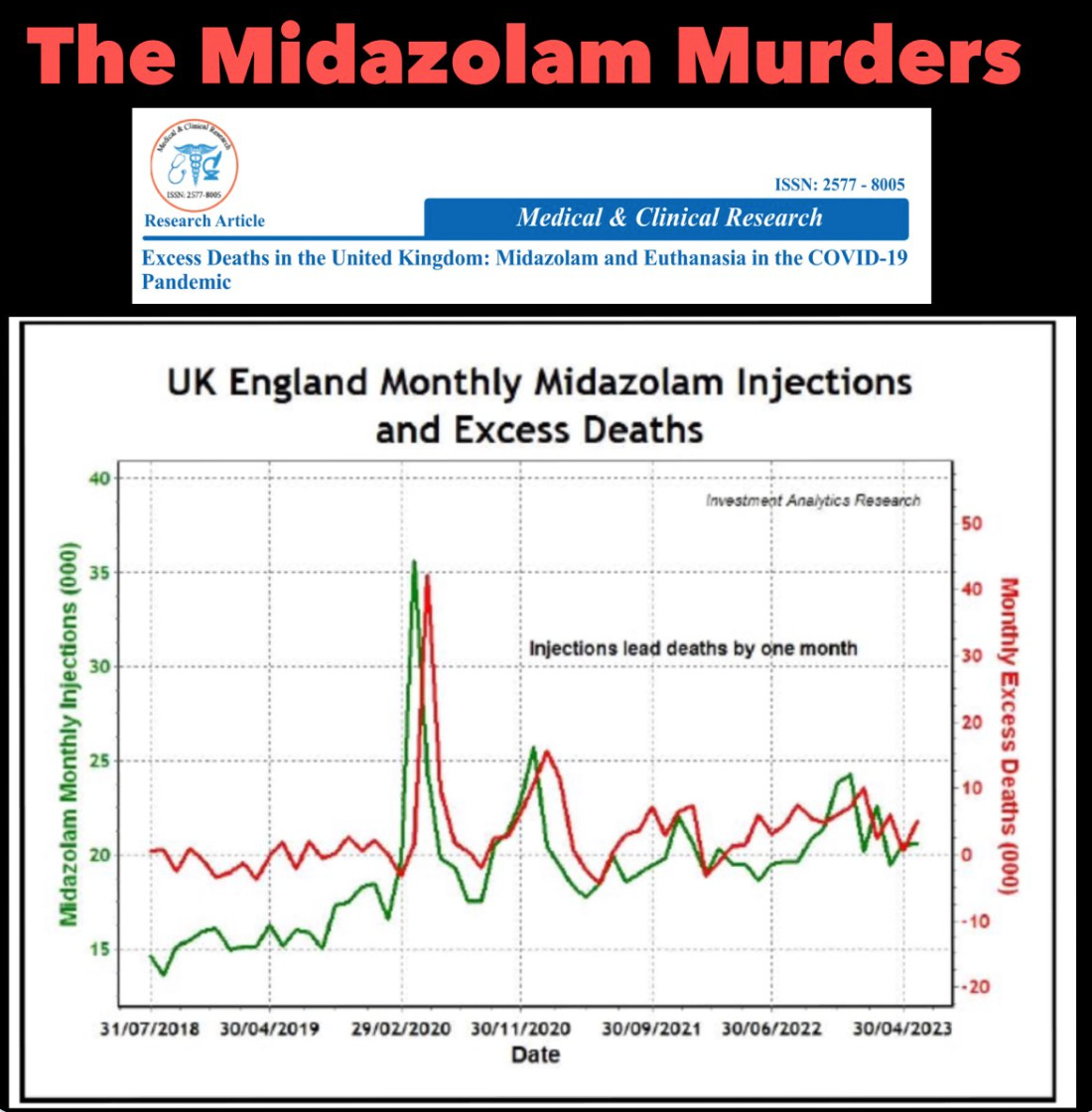 “The UK COVID-19 pandemic was iatrogenic (ie: deaths caused by the medical intervention itself - Ed.), created with widespread and persistent use of Midazolam injections in all regions of England, particularly in care homes, under a systemic policy of euthanasia. The nature of the euthanasia needs further investigation. Statistically, Midazolam injections were highly correlated with UK excess deaths throughout the pandemic, overwhelming COVID-19 disease or vaccination as other possible explanations for excess mortality.”