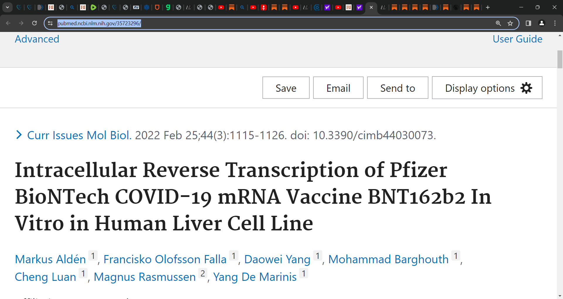 ‘a recent study showed that SARS-CoV-2 RNA can be reverse-transcribed and integrated into the genome of human cells. In this study…investigated the effect of Pfizer BNT162b2 on the human liver cell line Huh7 in vitro. Huh7 cells were exposed to BNT162b2, and quantitative PCR was performed on RNA extracted from the cells. We detected high levels of BNT162b2 in Huh7 cells and changes in gene expression of long interspersed nuclear element-1 (LINE-1), which is an endogenous reverse transcriptase. Immunohistochemistry using antibody binding to LINE-1 open reading frame-1 RNA-binding protein (ORFp1) on Huh7 cells treated with BNT162b2 indicated increased nucleus distribution of LINE-1. PCR on genomic DNA of Huh7 cells exposed to BNT162b2 amplified the DNA sequence unique to BNT162b2.