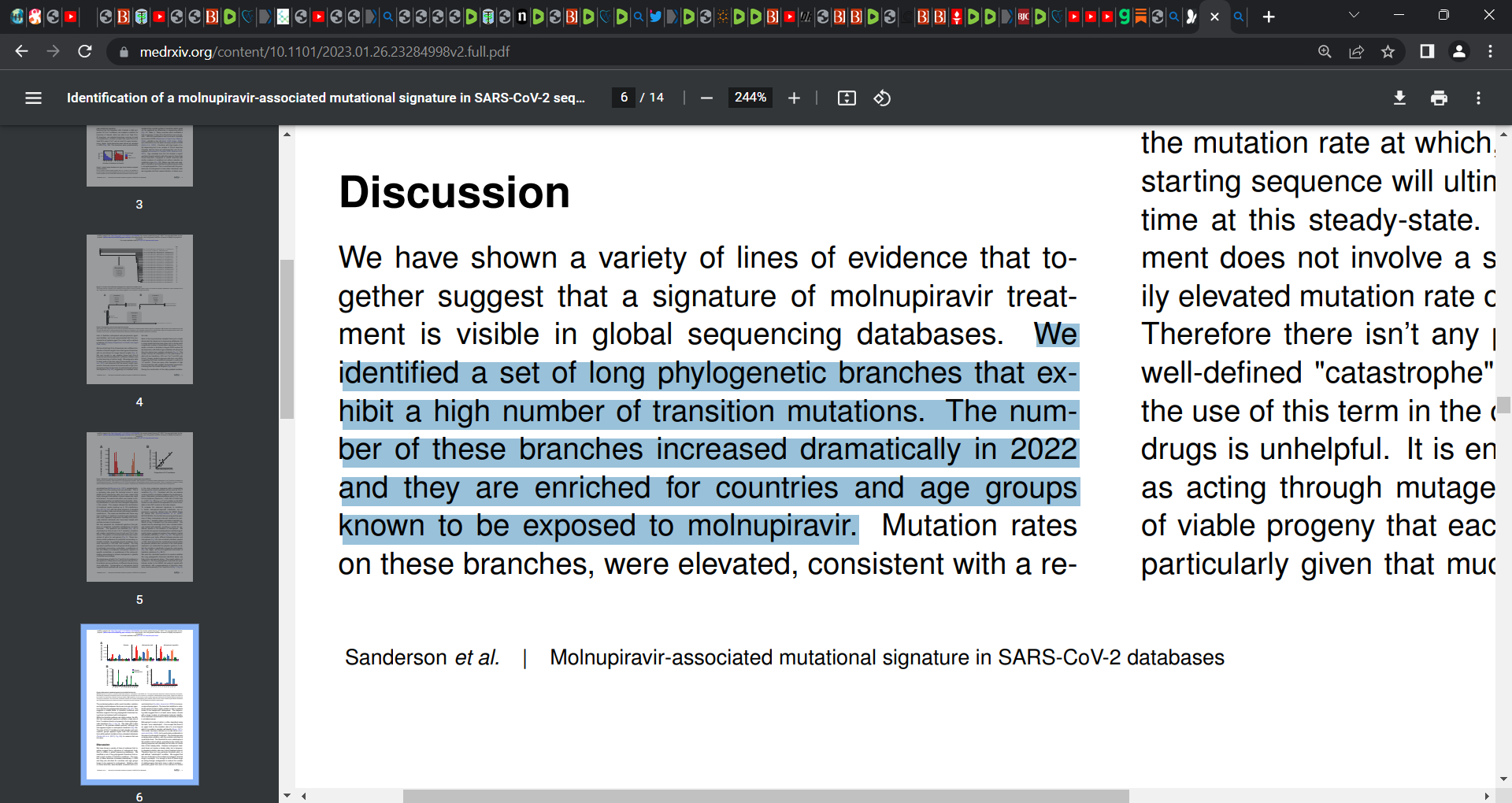 ‘It is possible that some patients treated with molnupiravir might not fully clear SARS-CoV-2 infections, with the potential for onward transmission of molnupiravir-mutated viruses…find that a specific class of long phylogenetic branches appear almost exclusively in sequences from 2022, after the introduction of molnupiravir treatment, and in countries and age-groups with widespread usage of the drug…show that its signature, with elevated G-to-A and C-to-T rates, largely corresponds to the mutational spectrum seen in these long branches. Our data suggest a signature of molnupiravir mutagenesis can be seen in global sequencing databases, in some cases with onwards transmission.’