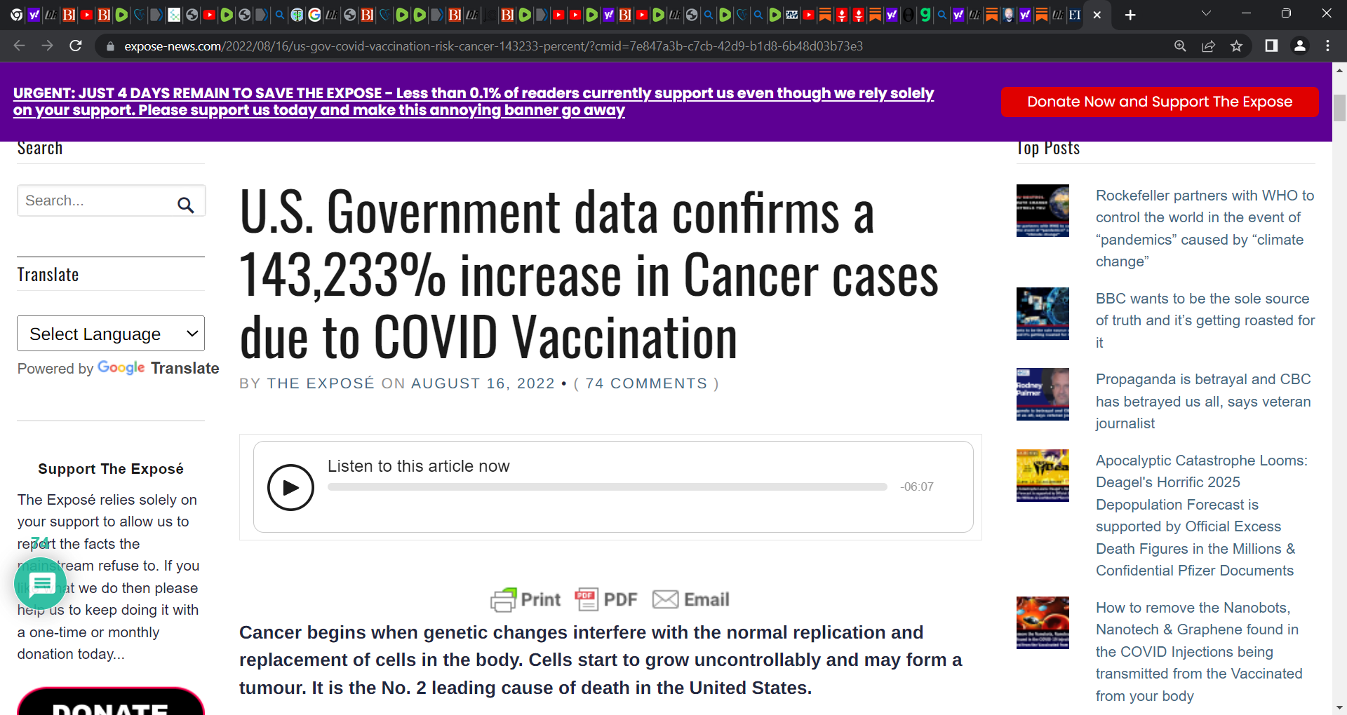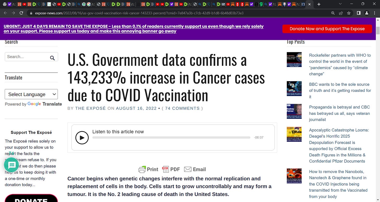 U.S. Government data confirms a 143,233% (one hundred and forty thousand percent increased risk) increase in Cancer cases due to COVID Vaccination; shocking headline by EXPOSE