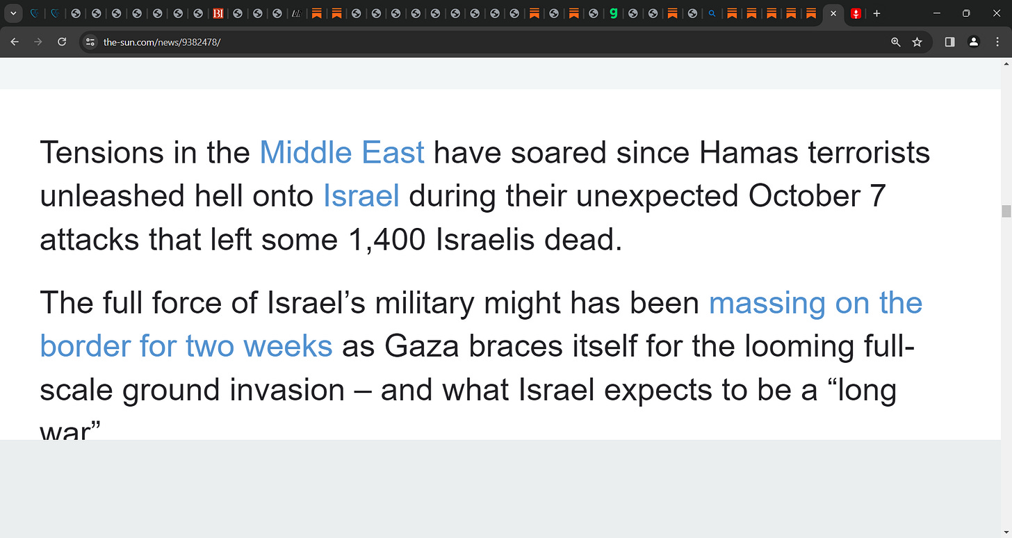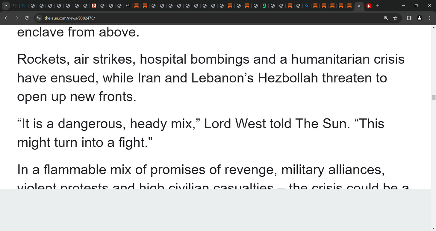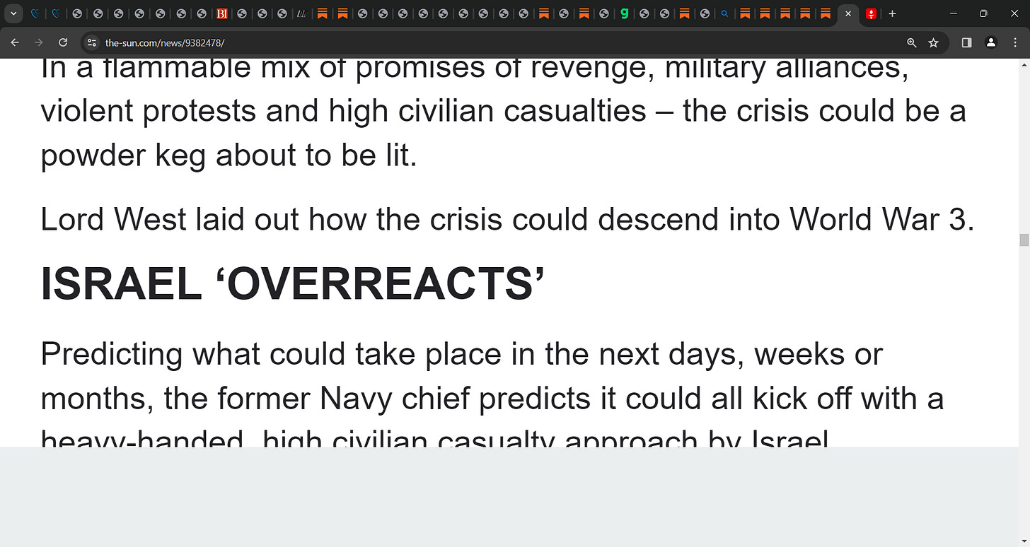 You missed the part about Turkey sending its Navy into the Eastern Med, and then China has announced sending a fleet there as well. That's after the US sent one carrier group and is delaying on sending another one. Do the Iranians have nukes ? Well the Russians do and they have them on their hypersonic missiles, and on Migs patrolling the skies over the Black Sea. Netanyahu is a NWO puppet of the worst kind, who will kill his own people first, before slaughtering the Palestinians. The US needs to dis-associate with the whole situation, but then the US is part of the NWO too. They don't want a cease fire. They want to cleanse Palestine of the Palestinians. That stain will never be wiped away...