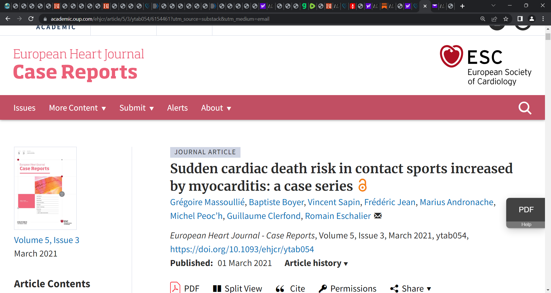 Sudden cardiac death risk in contact sports increased by myocarditis: a case series