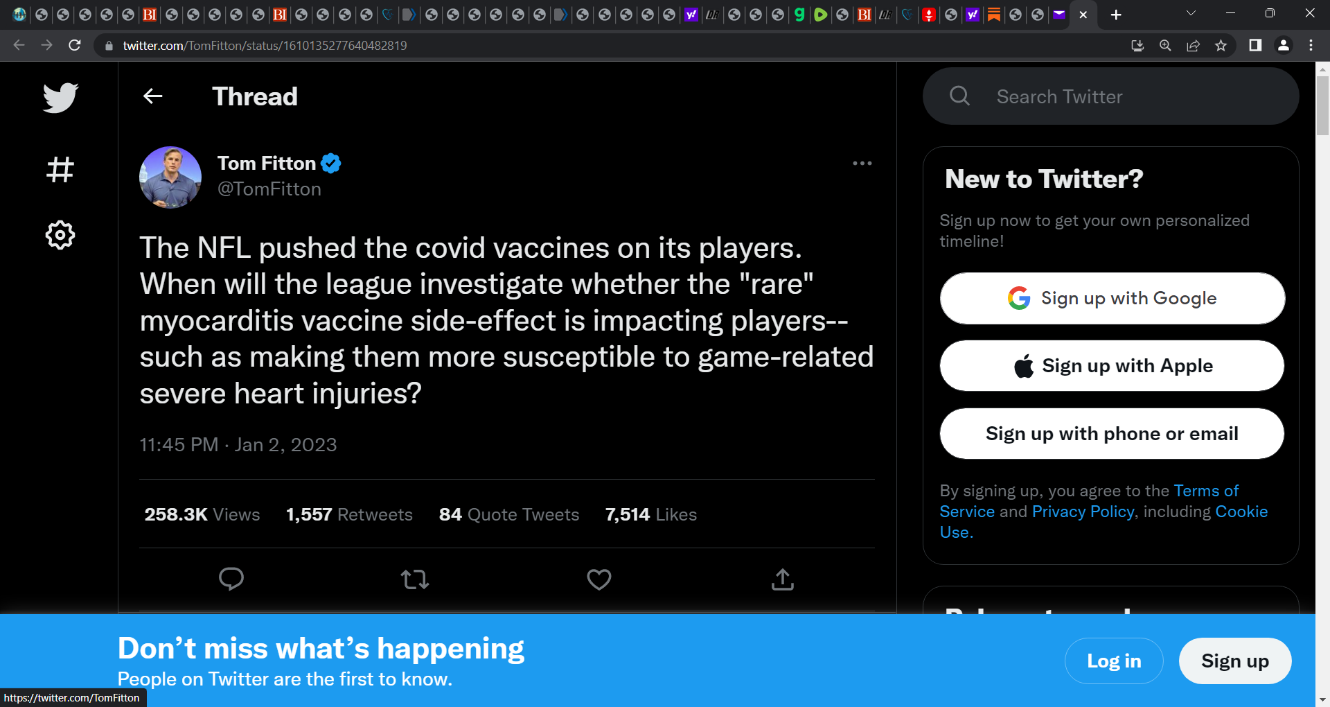“The most likely diagnosis from the little certainty we have so far, is vaccine-induced myocardial scarring (from prior COVID injection) that lead to a high-adrenaline arrhythmia episode causing cardiac arrest. The chance of vaccine myocarditis scarring and subsequent arrhythmic predisposition is much greater than the chance of Commotio Cordis absent vaccine cardiac injury. Commotio Cordis is very rare in his age range, non-projectile Commotio Cordis even rarer, vaccine myocardial scarring is very common, the hit on the play was not a major chest blow, and the Buffalo Bills have stated that they are 100% vaccinated. Had he suffered onset of ventricular arrythmia at the time of chest impact it is unlikely he could have finished a tackle, let alone gotten to his feet after the play. The most likely diagnosis from the little certainty we have is vaccine-induced myocardial scarring leading to high-adrenaline arrhythmia. But he only reason for this uncertainty should be the player’s or his family’s desire for privacy. The CDC, FDA or NIH can and should address this. Cardiac MRI looking for late gadolinium enhancement, review of mis medical records including vaccine records and response to those, or autopsy in the horrific even he should pass, should be offered by the government for free, if not because the most likely diagnosis is vaccine induced myocardial injury, then for the sake of easing the population’s fears. The failure to do so will be more telling than the results.”