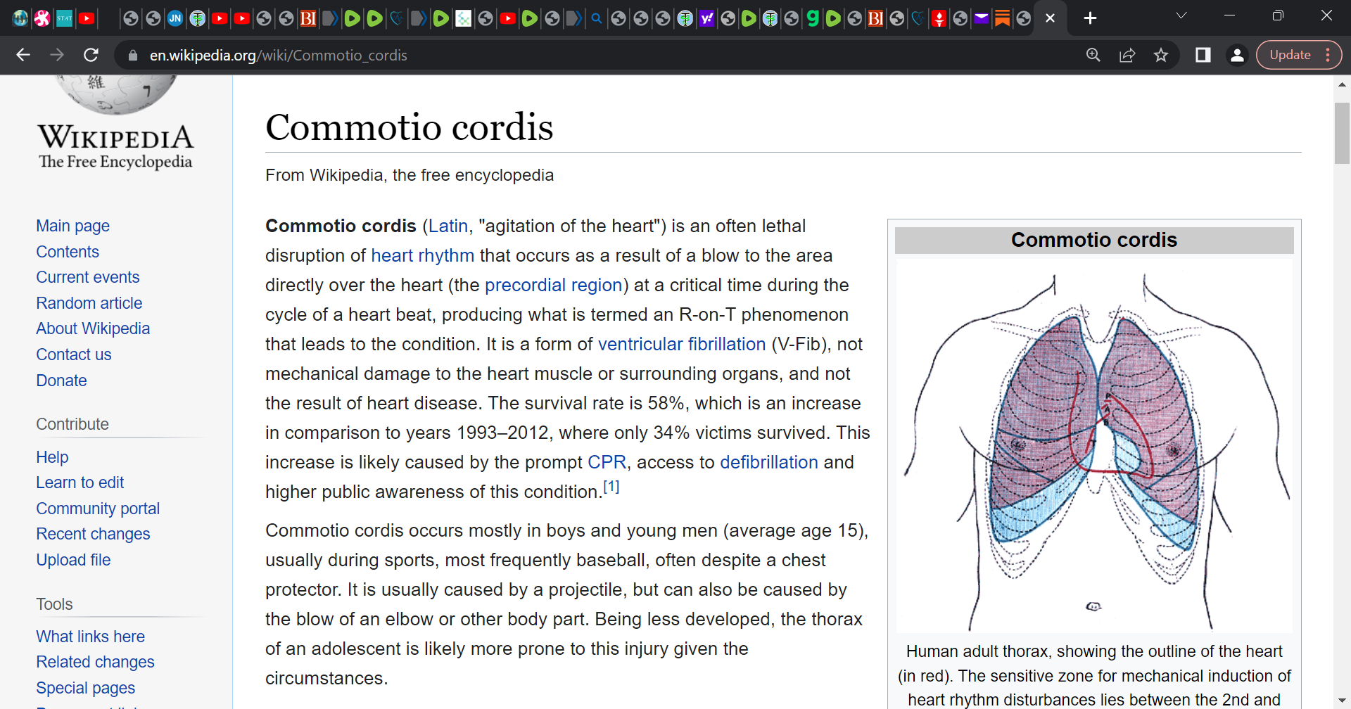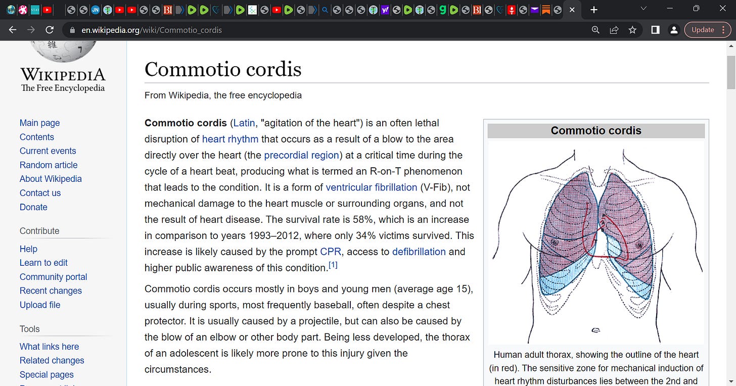 ‘Commotio cordis (Latin, "agitation of the heart") is an often lethal disruption of heart rhythm that occurs as a result of a blow to the area directly over the heart (the precordial region) at a critical time during the cycle of a heart beat, producing what is termed an R-on-T phenomenon that leads to the condition. It is a form of ventricular fibrillation (V-Fib), not mechanical damage to the heart muscle or surrounding organs, and not the result of heart disease. The survival rate is 58%, which is an increase in comparison to years 1993–2012, where only 34% victims survived. This increase is likely caused by the prompt CPR, access to defibrillation and higher public awareness of this condition.[1]