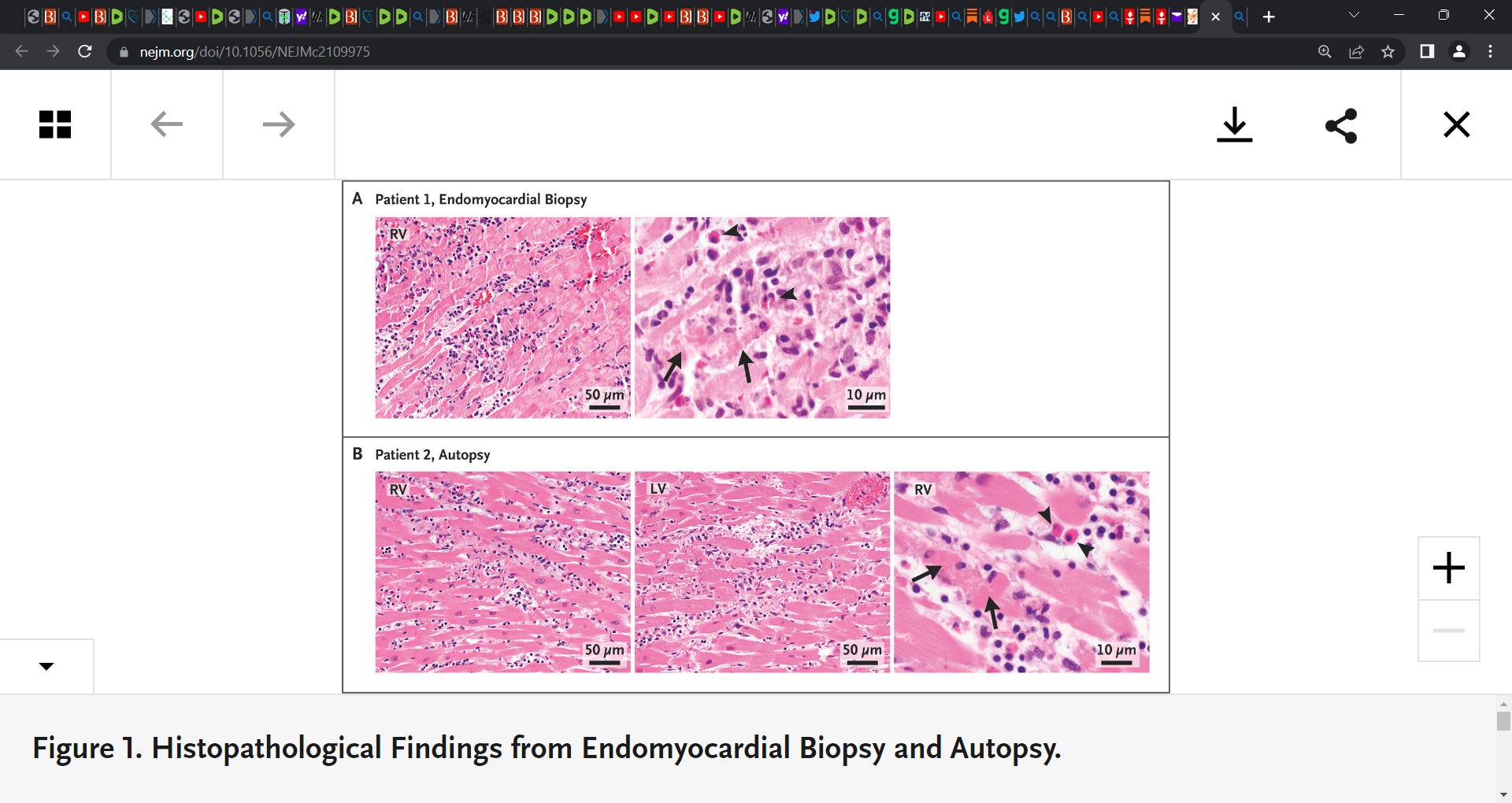 ‘Patient 1, a 45-year-old woman without a viral prodrome, presented with dyspnea and dizziness 10 days after BNT162b2 vaccination (first dose). A nasopharyngeal viral panel was negative for severe acute respiratory syndrome coronavirus 2 (SARS-CoV-2), influenza A and B, enteroviruses, and adenovirus (Table S1 in the Supplementary Appendix, available with the full text of this letter at NEJM.org). A serum polymerase-chain-reaction (PCR) assay and serologic tests showed no evidence of active parvovirus, enterovirus, human immunodeficiency virus, or infection with SARS-CoV-2. At presentation, she had tachycardia; ST-segment depression detected on electrocardiography, which was most prominent in the lateral leads (Fig. S1); and a troponin I level of 6.14 ng per milliliter (reference range, 0 to 0.30). A transthoracic echocardiogram showed severe global left ventricular systolic dysfunction (ejection fraction, 15 to 20%) and normal left ventricular dimensions. Right heart catheterization revealed elevated right- and left-sided filling pressures and a cardiac index of 1.66 liters per minute per square meter of body-surface area as measured by the Fick method. Coronary angiography revealed no obstructive coronary artery disease. An endomyocardial biopsy specimen showed an inflammatory infiltrate predominantly composed of T-cells and macrophages, admixed with eosinophils, B cells, and plasma cells (Figure 1A and Figs. S2 through S4). She received inotropic support, intravenous diuretics, methylprednisolone (1 g daily for 3 days), and, eventually, guideline-directed medical therapy for heart failure (lisinopril, spironolactone, and metoprolol succinate). Seven days after presentation, her ejection fraction was 60%, and she was discharged home.