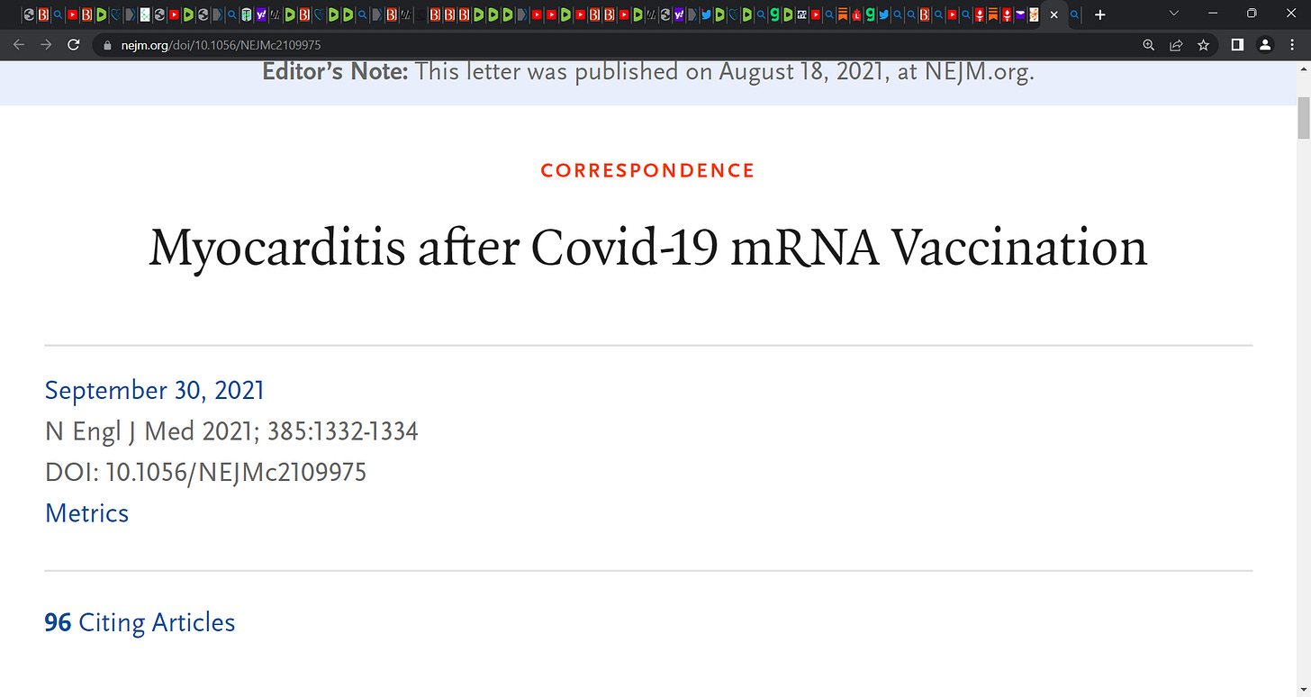 Verma et al.: "Myocarditis after Covid-19 mRNA Vaccination"; report two cases of histologically confirmed myocarditis after Covid-19 mRNA vaccination.