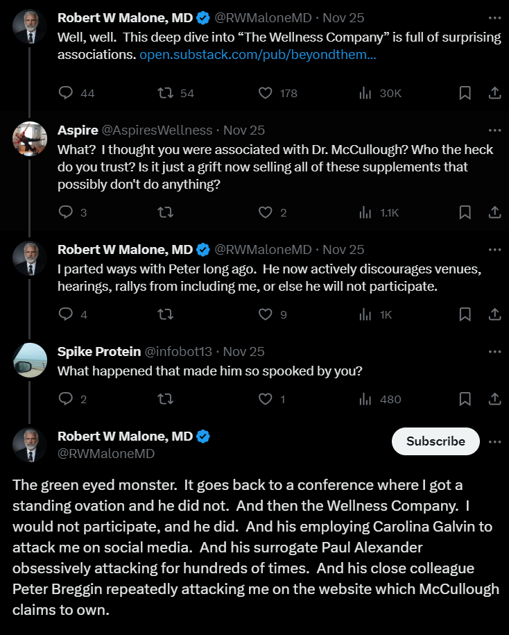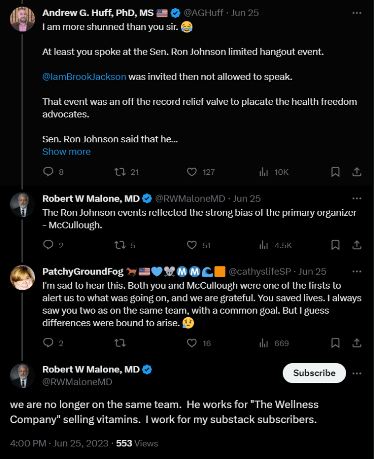 In June 2023, Dr. Robert Malone expressed disappointment over a perceived bias at Senator Ron Johnson’s “COVID-19 Vaccines: What They Are, How They Work, and Possible Causes of Injuries” event, which Dr. McCullough helped organize. Malone indicated a division between McCullough and himself, noting that they are “no longer on the same team.” Malone also accused McCullough of prioritizing profits over people, stating, “He [McCullough] works for ‘The Wellness Company’ selling vitamins. I work for my substack subscribers.”
