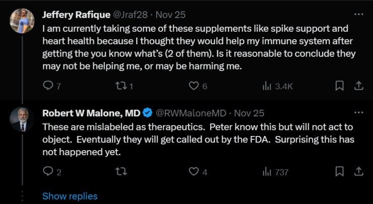 “These [supplements] are mislabeled as therapeutics. Peter [McCullough] know[s] this but will not act to object. Eventually, they will get called out by the FDA. Surprising, this has not happened yet.”