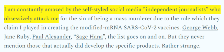 The pioneer in mRNA vaccine technology seems to have a pattern of lashing out against anyone who levels the slightest criticism of him and has attempted to diminish his critics by claiming that they “appear to be getting compensated in some way for actively promoting hate.”
