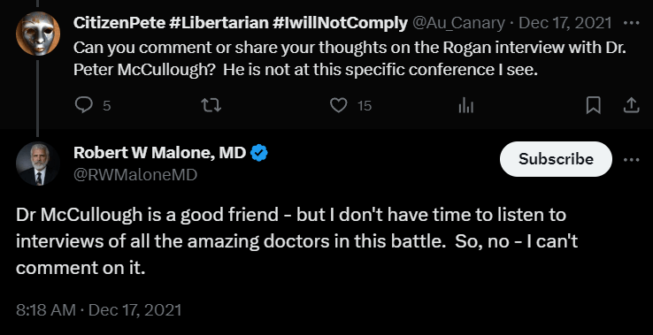 Dr. McCullough has refrained from engaging in public criticism of Dr. Malone on social media platforms like X. Conversely, Dr. Malone has, on multiple occasions, publicly scorned Dr. McCullough.