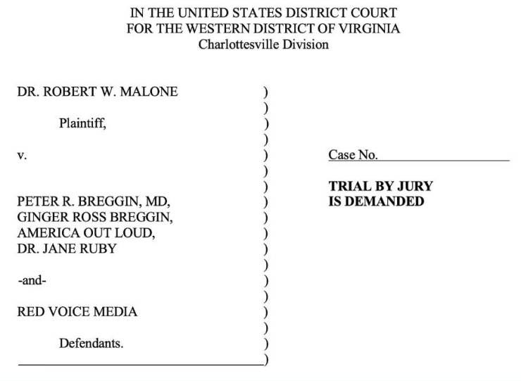 On October 30, 2022, Dr. Malone filed a lawsuit seeking $25 million in damages from Dr. Peter Breggin, Ginger Breggin, America Out Loud, Dr. Jane Ruby, and Red Voice Media (Stew Peters). This was described as a “shocking defamation lawsuit,” which Diana West called “an anti-personnel weapon of free-speech-destruction” and a “heat-seeking lawfare missile targeting financial ruin.”