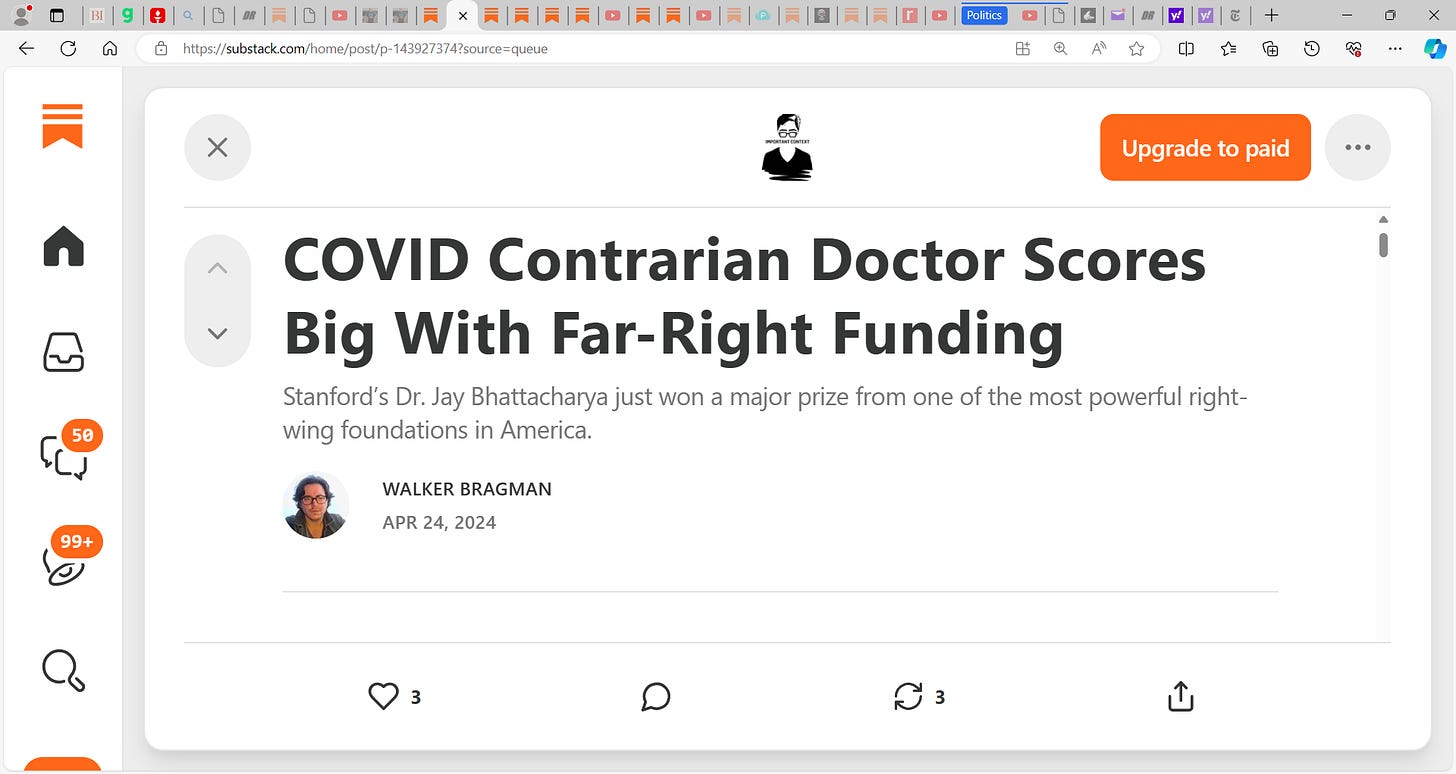 WALKER BRAGMAN wrote this substack and really shows us how batshit crazy we are today in our thinking: "COVID Contrarian Doctor Scores Big With Far-Right Funding; Stanford’s Dr. Jay Bhattacharya just