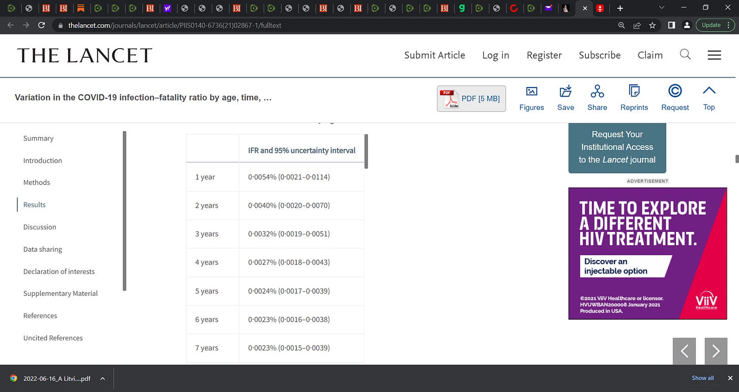 “Age-specific IFR estimates form a J shape, with the lowest IFR occurring at age 7 years (0·0023%, 95% uncertainty interval [UI] 0·0015–0·0039)”