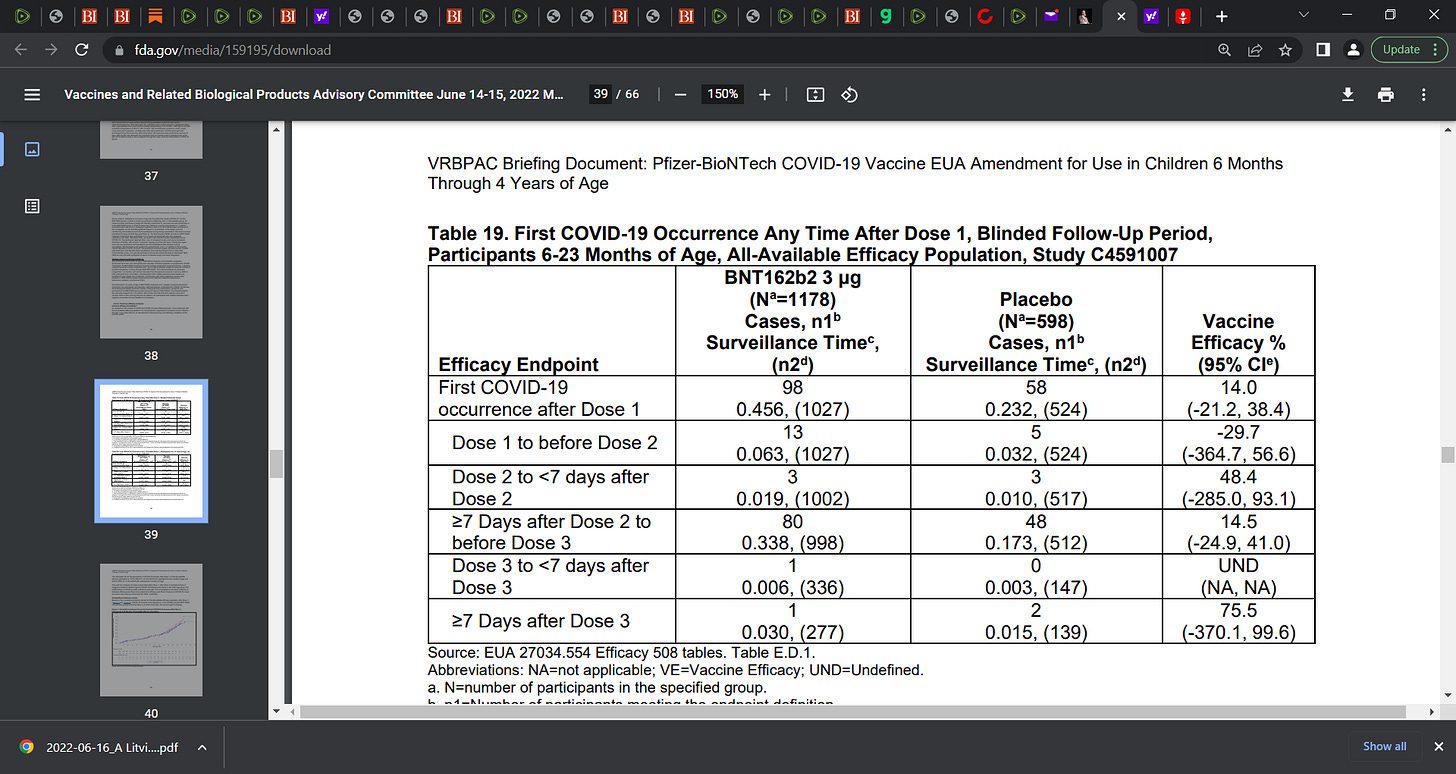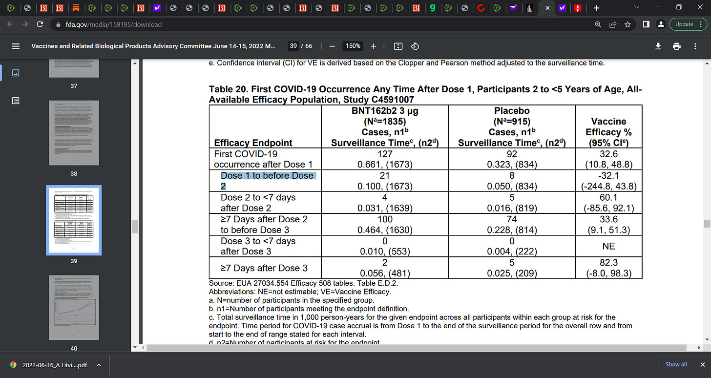 7)The FDA’s June 15th report is a very frightening report, see page 39, Tables 19 and 20 as to the negative efficacy post Dose 1 to before Dose 2