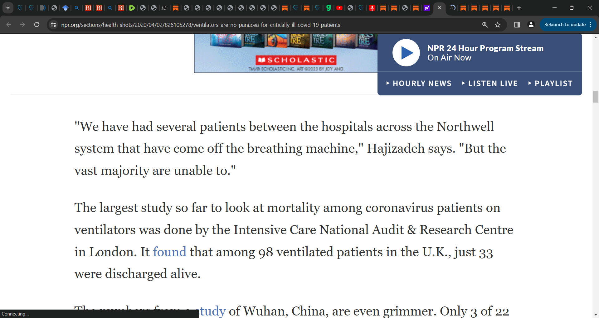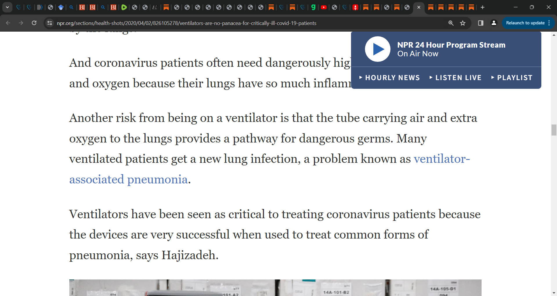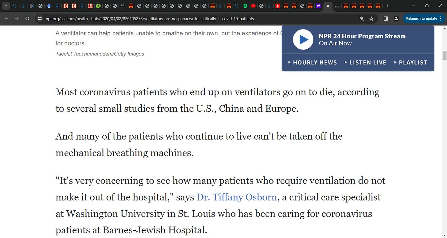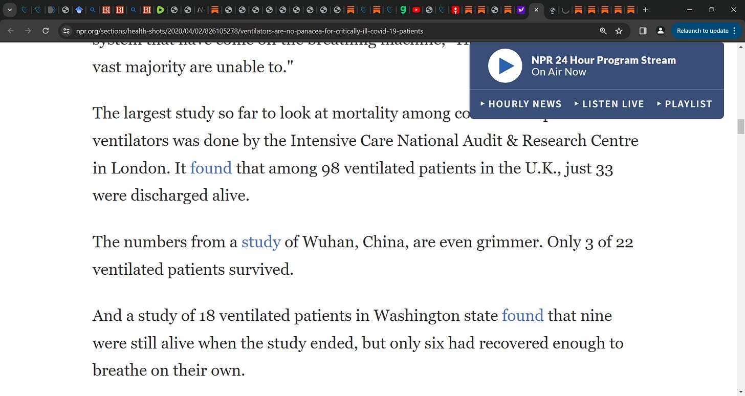 Ventilators KILLED near all who went on one for COVID, the sick bastards, the putrid deadly doctors were killing us with the ventilators for they did not know how to use them, nor the medical assistants, did not know how to calibrate, blowing holes in lungs already under trauma, causing more trauma and ventilator associated pneumonia (VAP) etc. Cuomo was right, as much as I disdained his leftist politics, he saw that most New Yorkers on the ventilator DIED.
