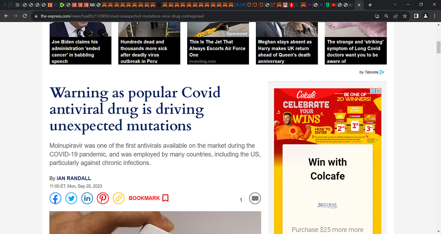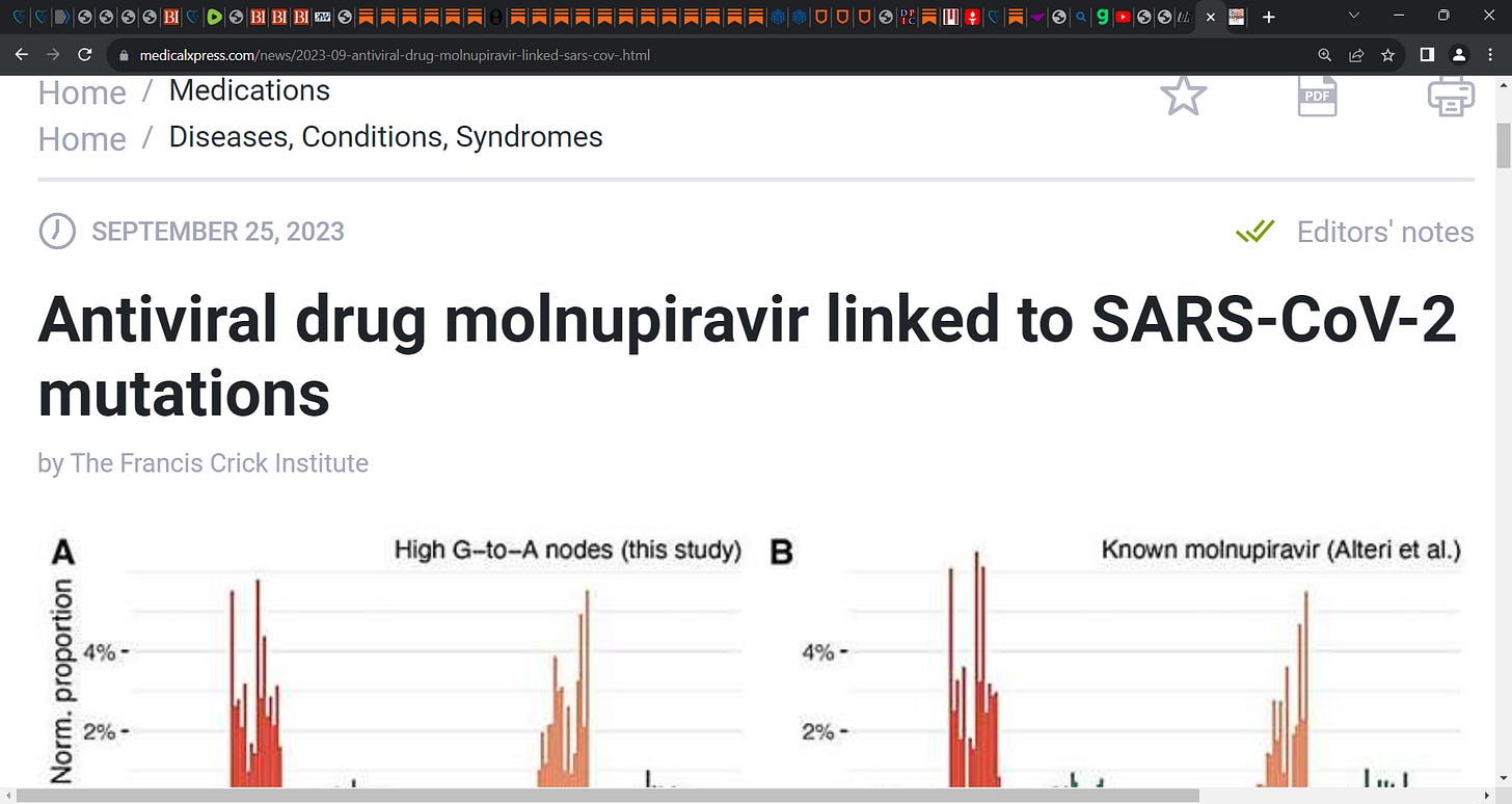 What? Antiviral drug molnupiravir (Merck & Ridgeback Biotherapeutics & we call it 'MONEY-PIRAVIR') linked to driving COVID virus mutations? see NATURE (Sanderson et al.); Molnupiravir & Paxlovid are