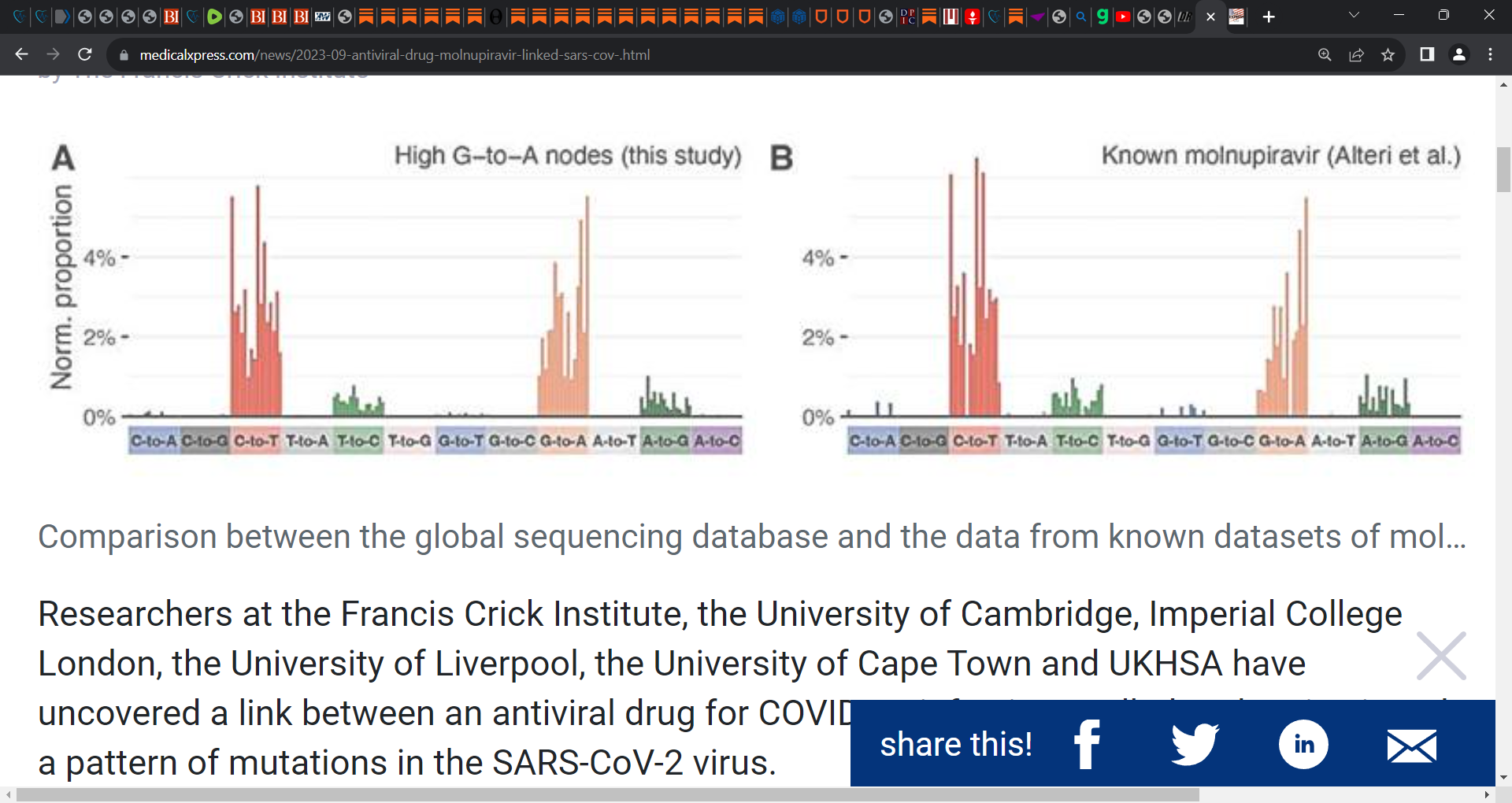 ‘Researchers at the Francis Crick Institute, the University of Cambridge, Imperial College London, the University of Liverpool, the University of Cape Town and UKHSA have uncovered a link between an antiviral drug for COVID-19 infections called molnupiravir and a pattern of mutations in the SARS-CoV-2 virus.’