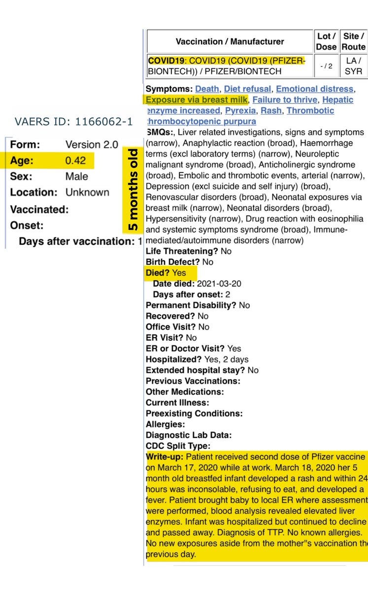 What do we do with this? CDC's VAERS database for COVID vaccine adverse effects; 5 month old baby boy’s mother got her 2nd dose Pfizer vaccine. see write-up; within 24 hours of breastfeeding