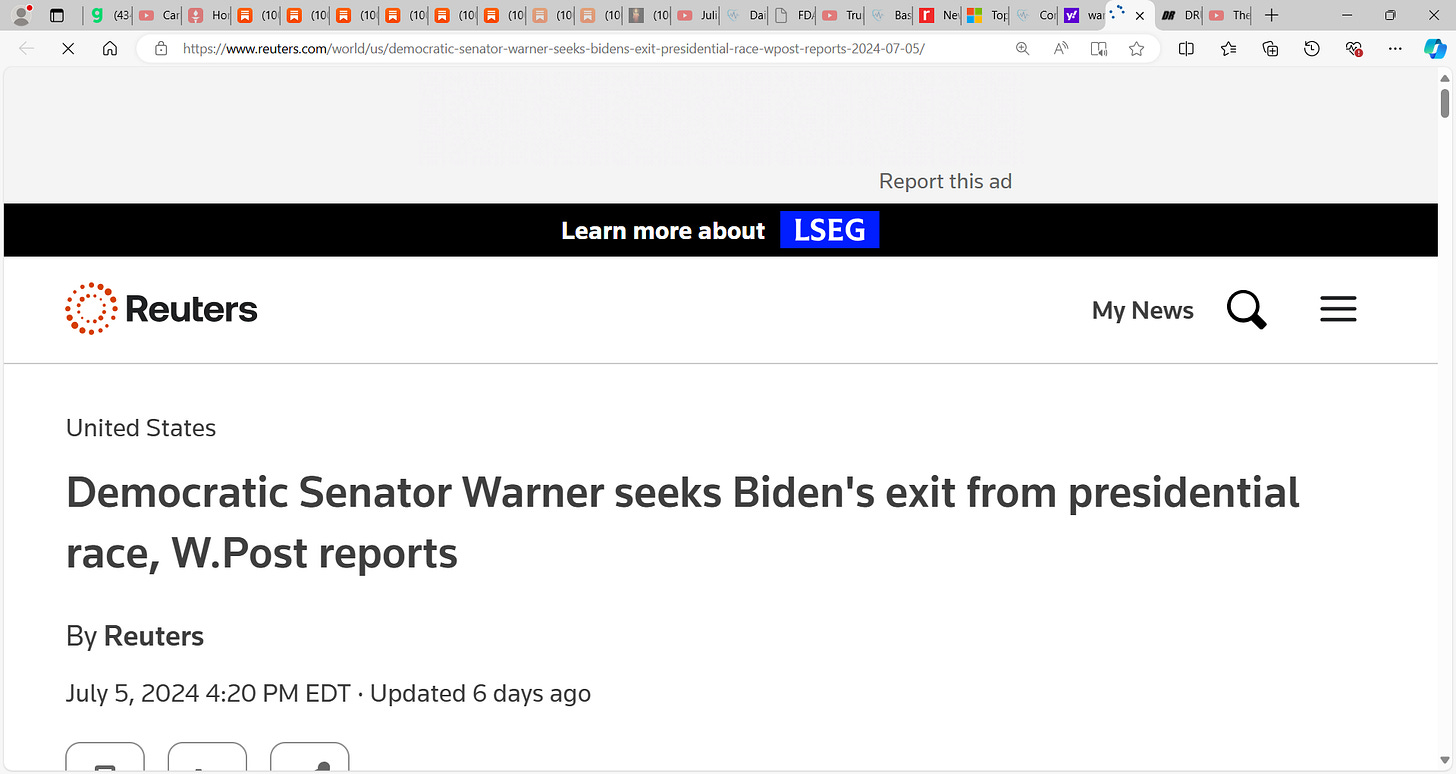 ‘U.S. Senator Mark Warner is attempting to assemble a group of Democratic senators to ask Joe Biden to exit the presidential race after last week's debate performance, the Washington Post reported on Friday, citing two unidentified people with knowledge of the effort.